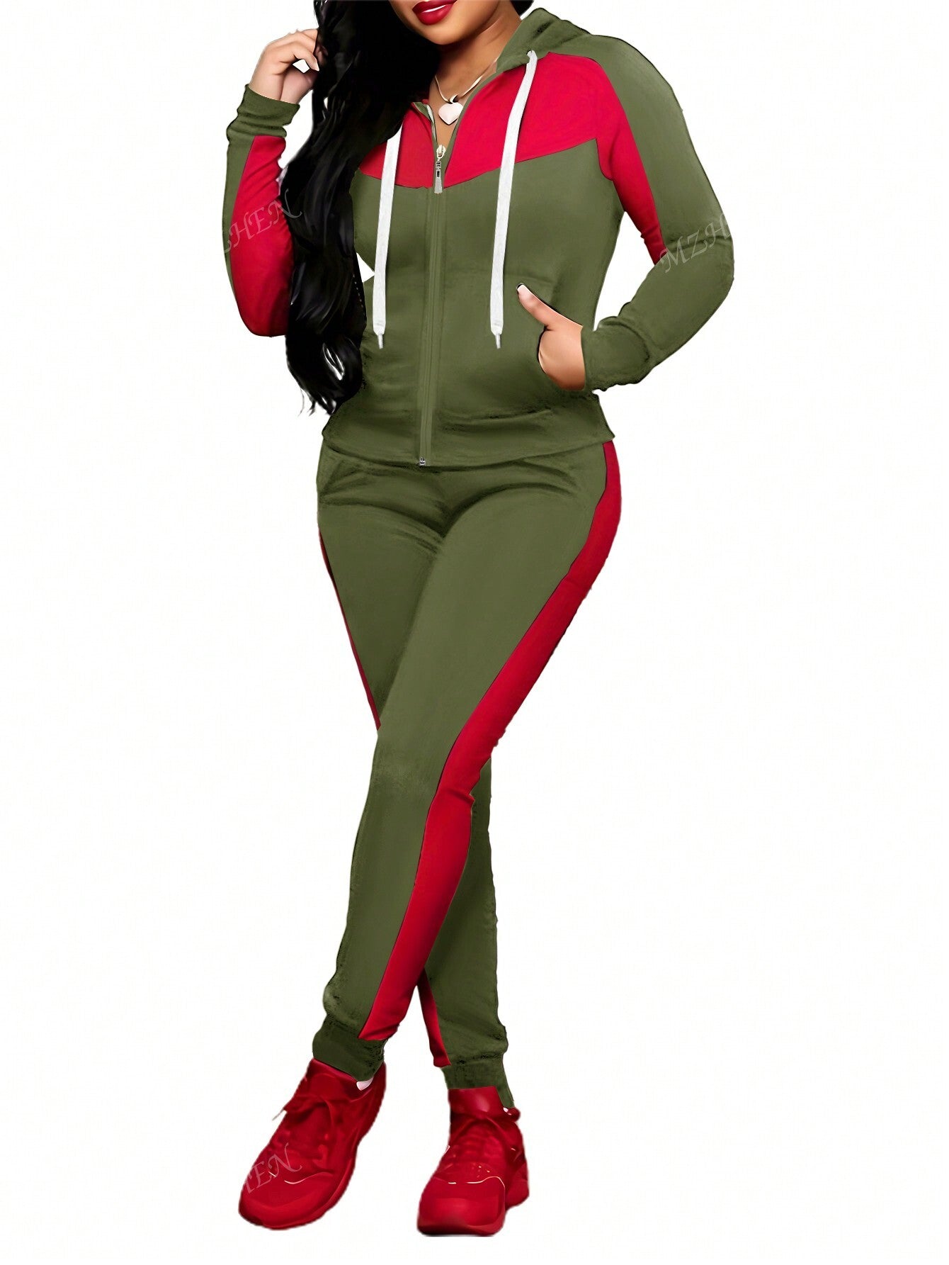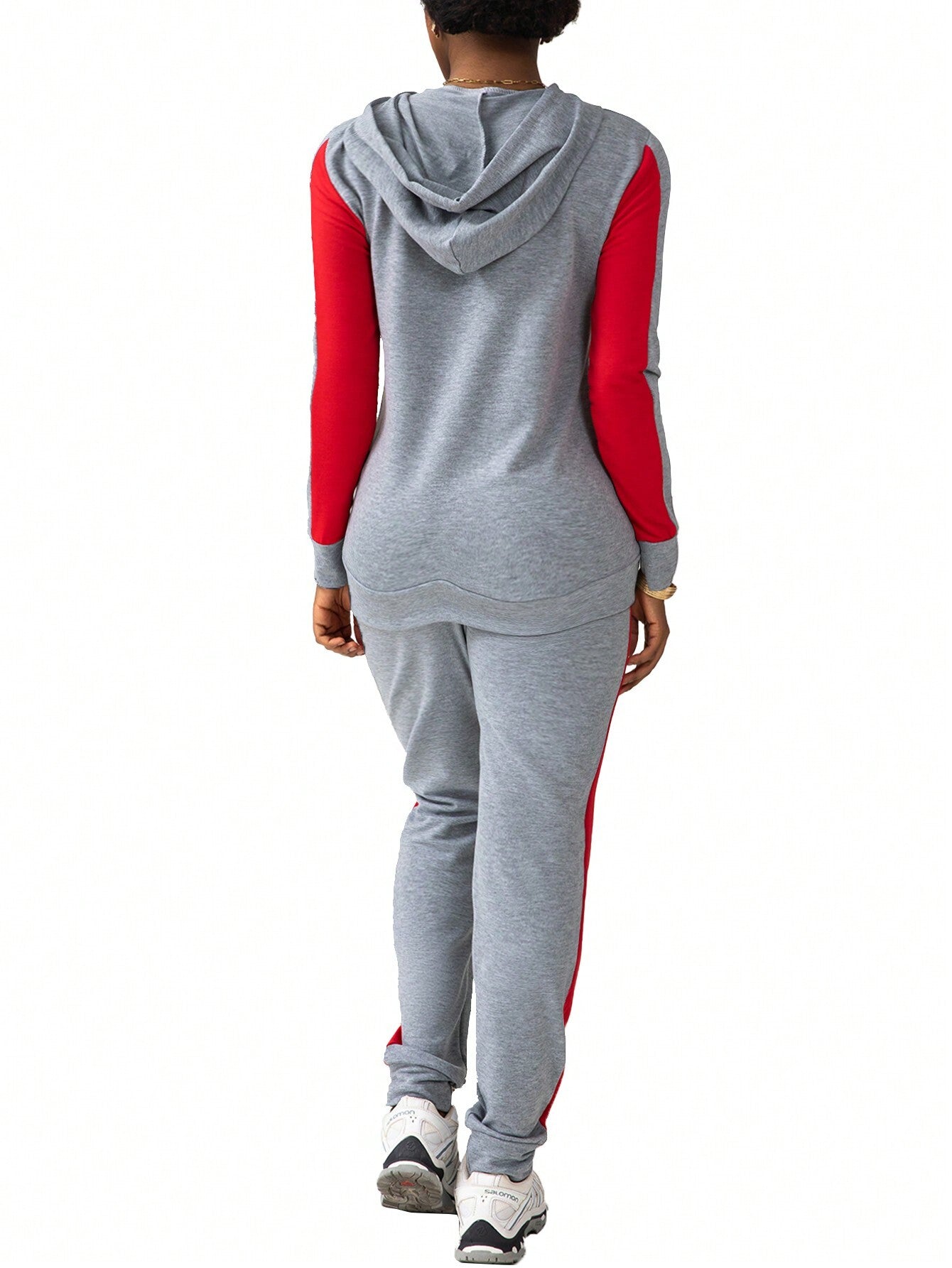 2pcs/Set Women Casual Color Block Hooded Zip-Up Sweatshirt And Pants Athletic Sportswear, Autumn