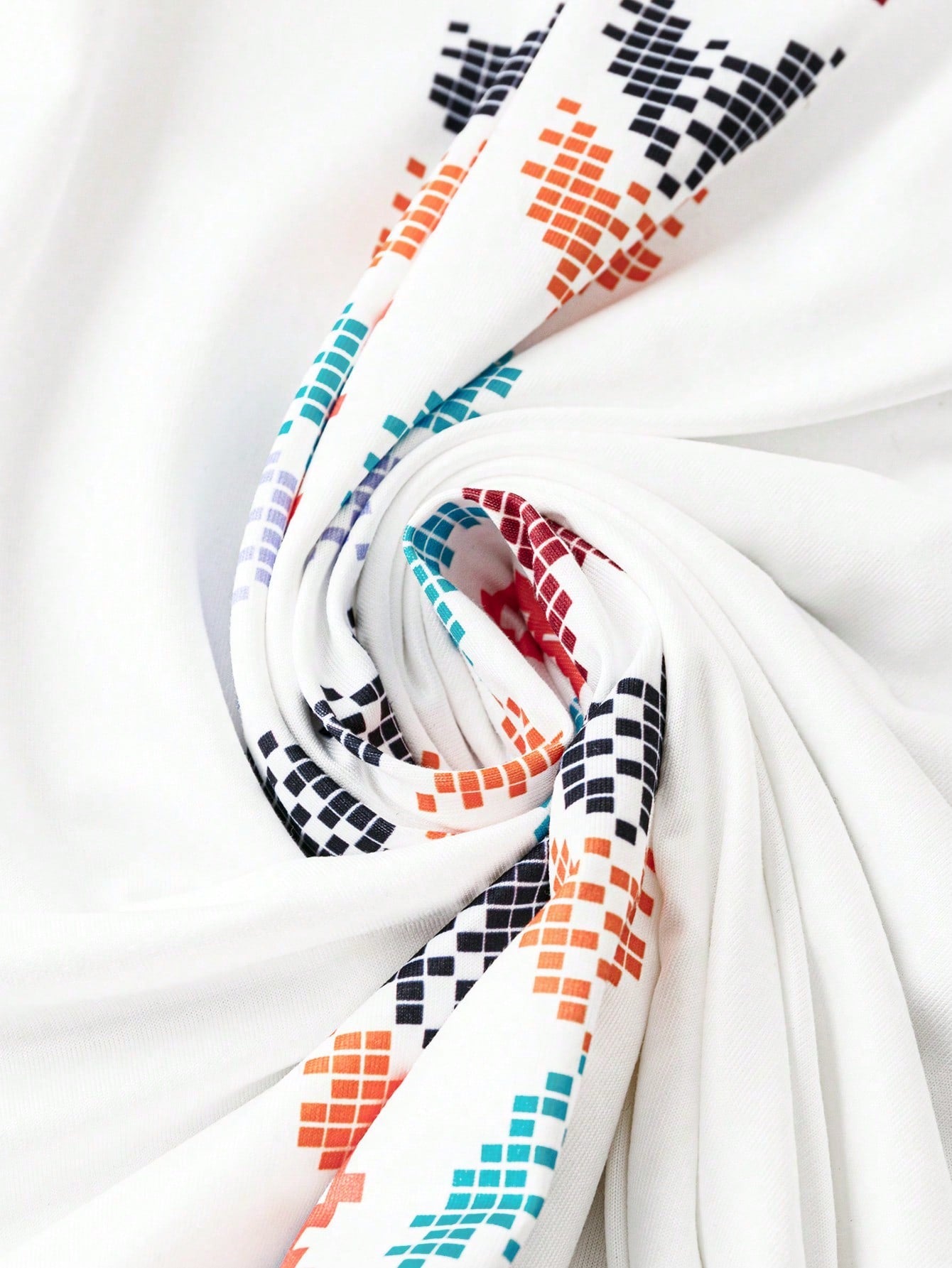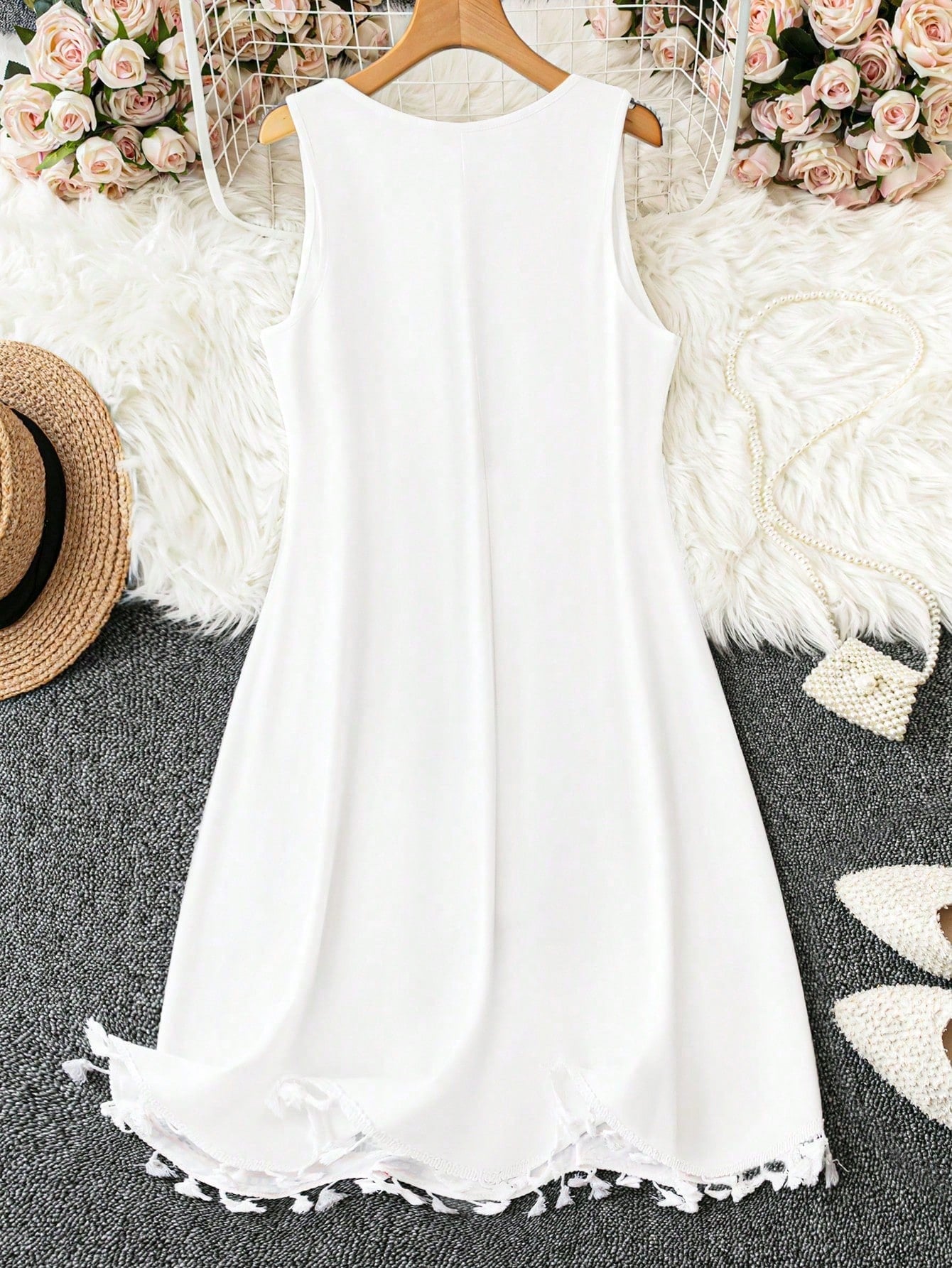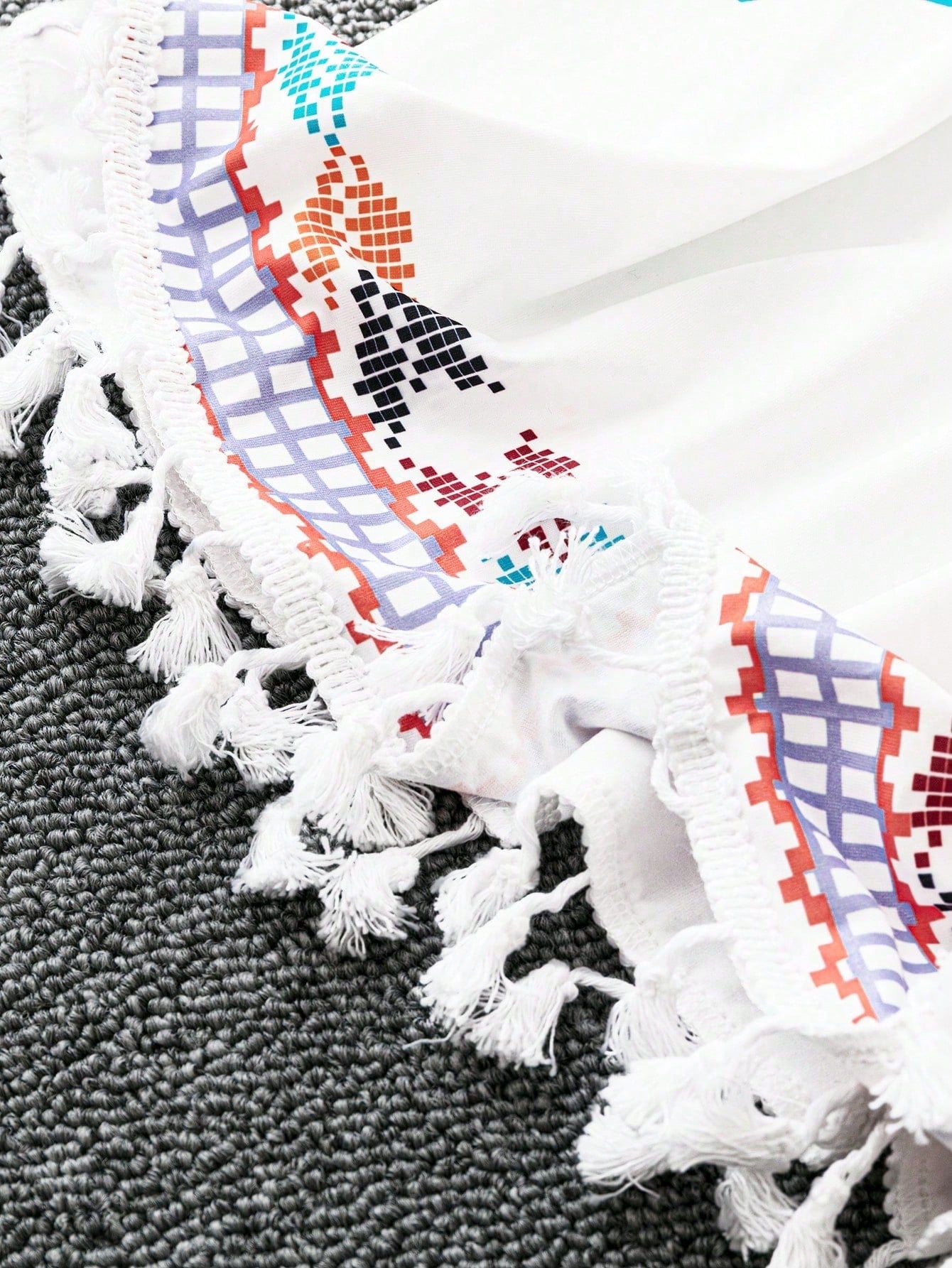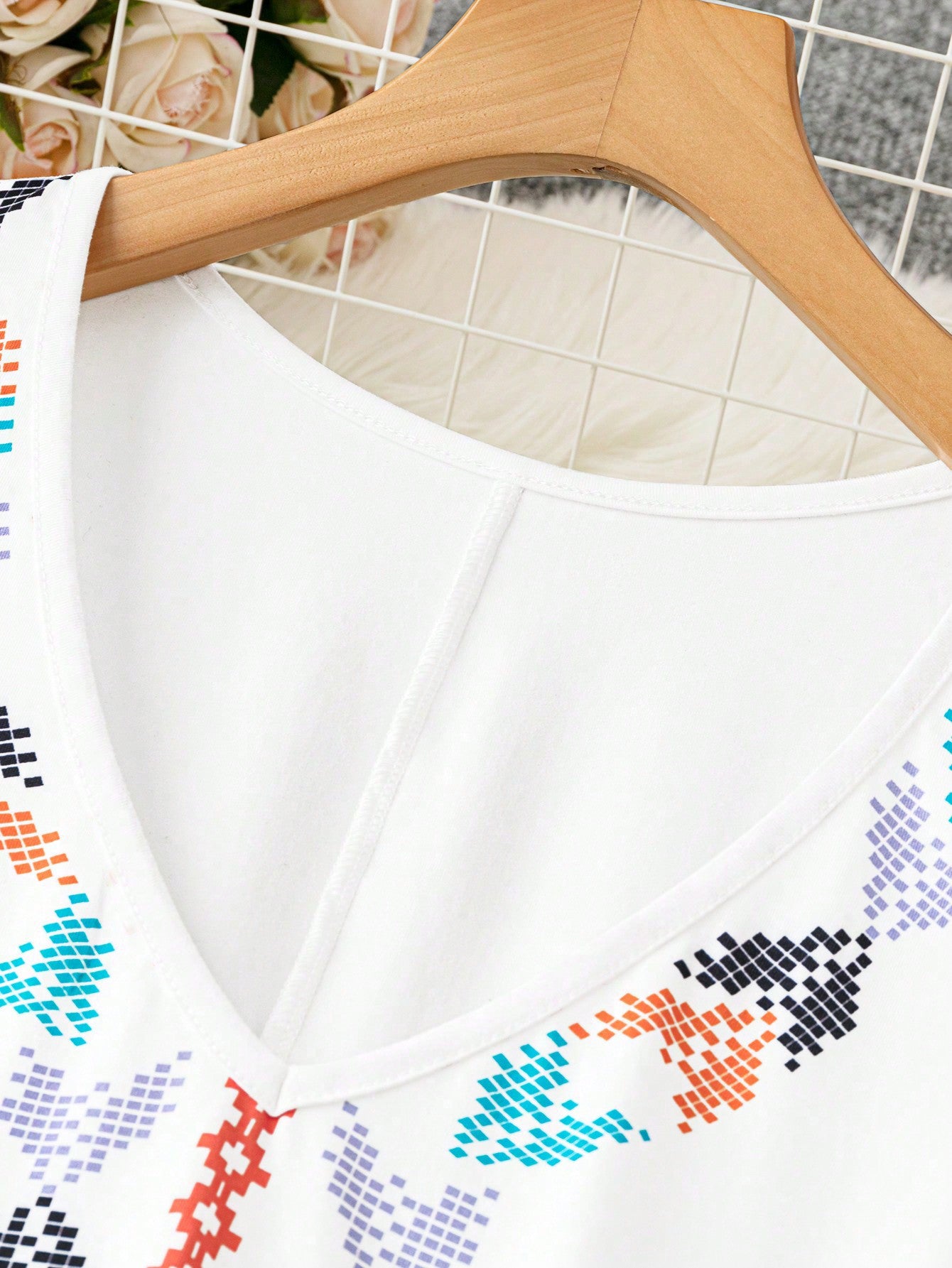 EMERY ROSE Plus Size Summer Casual Geometric Print V-Neck Fringed Hem Sleeveless Dress