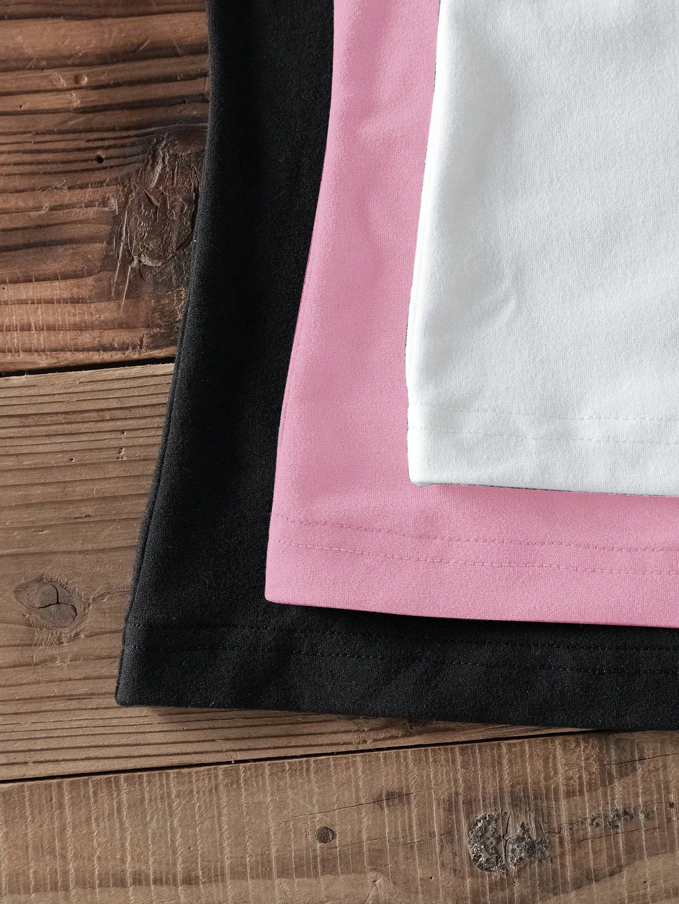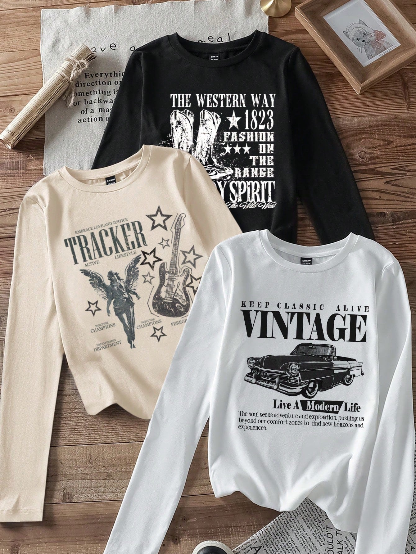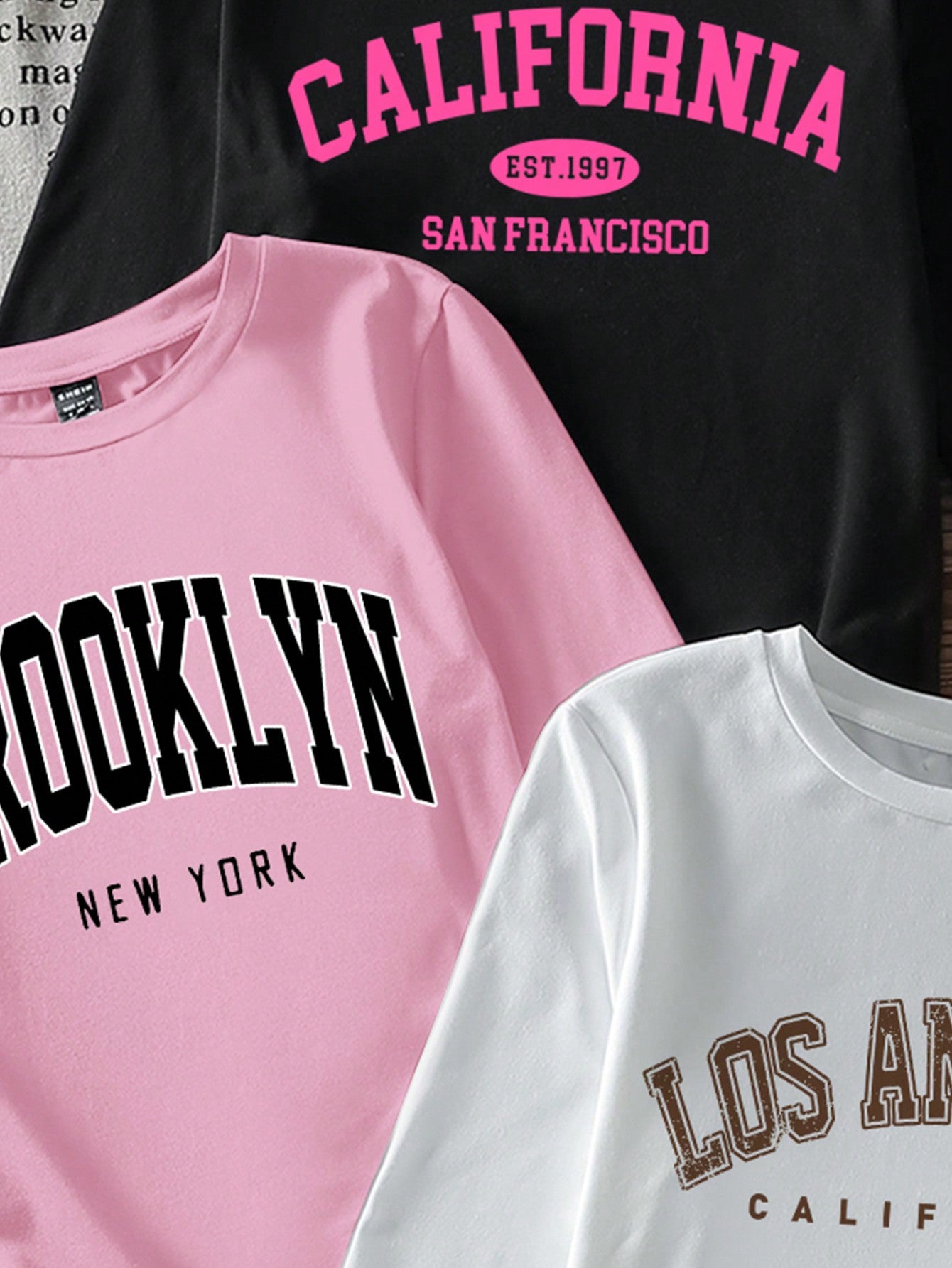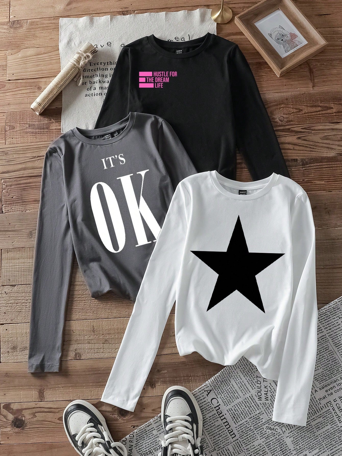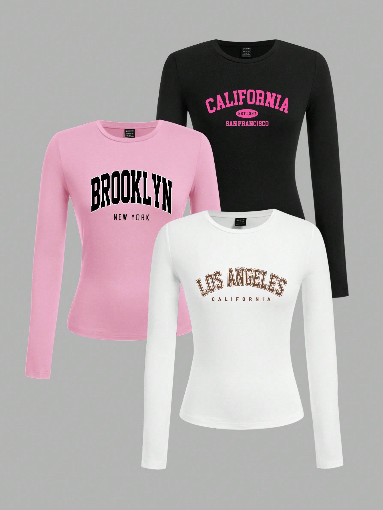 EZwear 3pcs Set Women Casual Letter Print Round Neck Slim Fit Long Sleeve T-Shirt Outfit, Suitable For Autumn