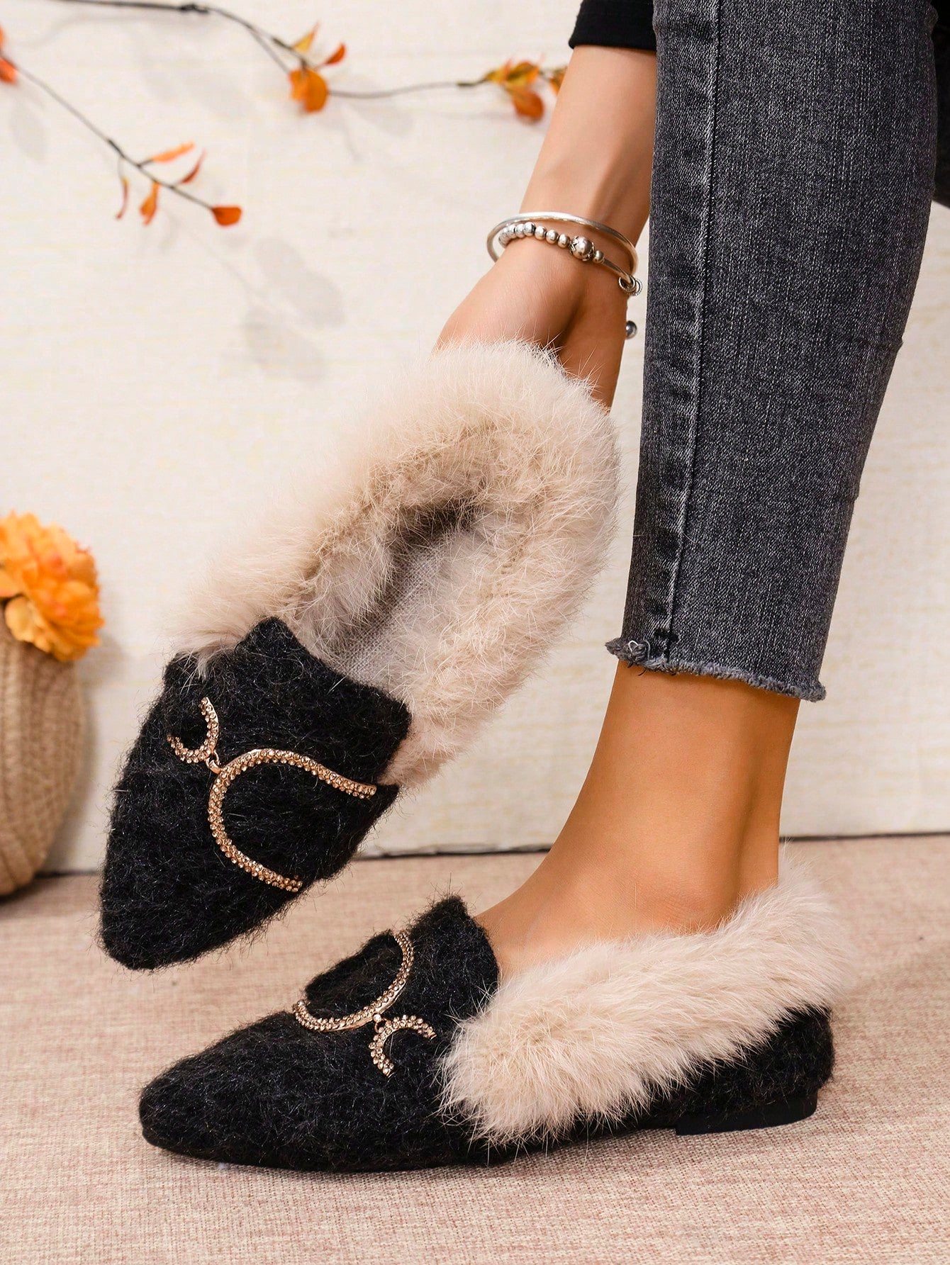 Fashionable Fluffy Flat Shoes, Fluffy Lining Warm Winter Casual Slip-On Shoes With Bow Decor, Pointed Toe, Rubber Sole For Outdoor/Daily Wear