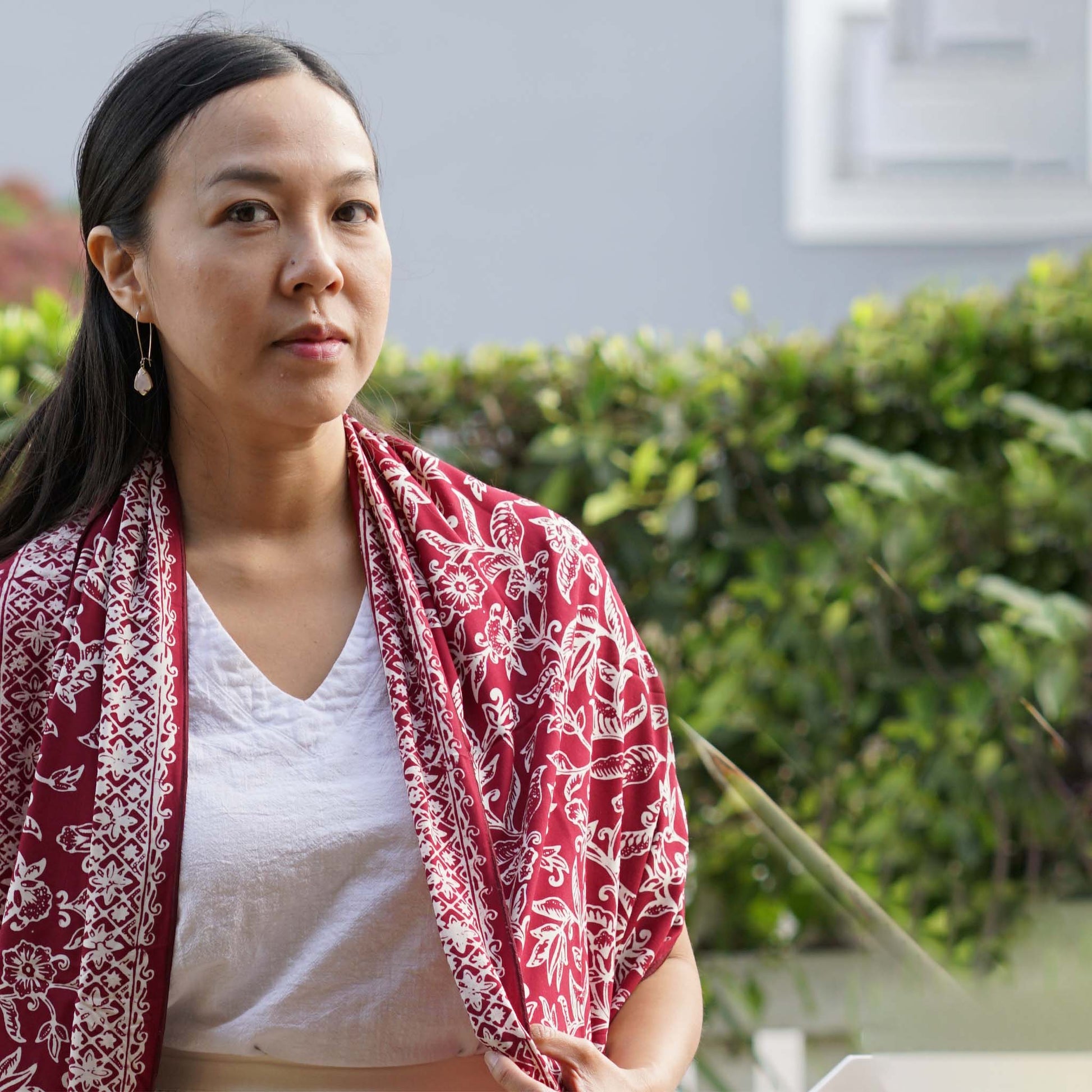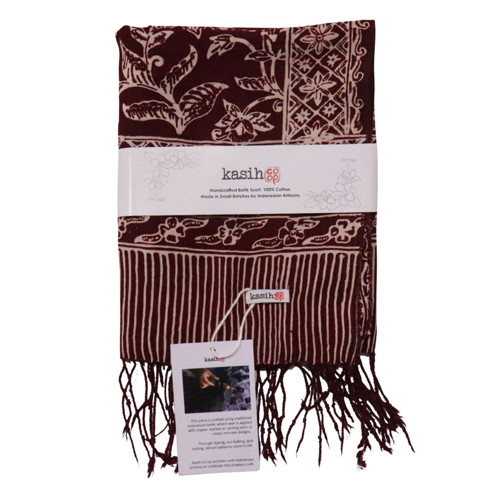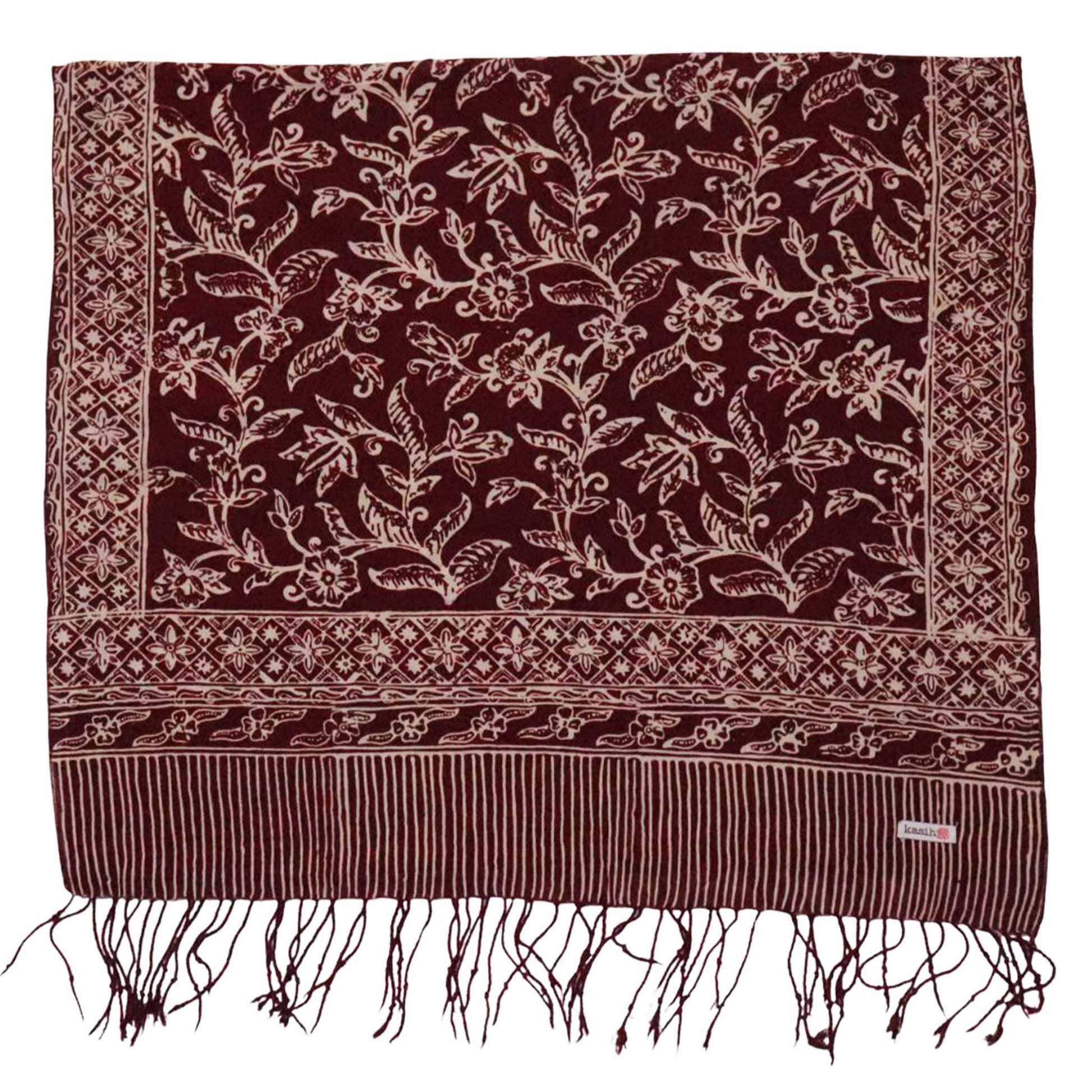 This is a hand-dyed and hand-stamped batik scarf, handmade by artisans. This fabric is handmade by artisans in Java using centuries old wax & dye batik technique.