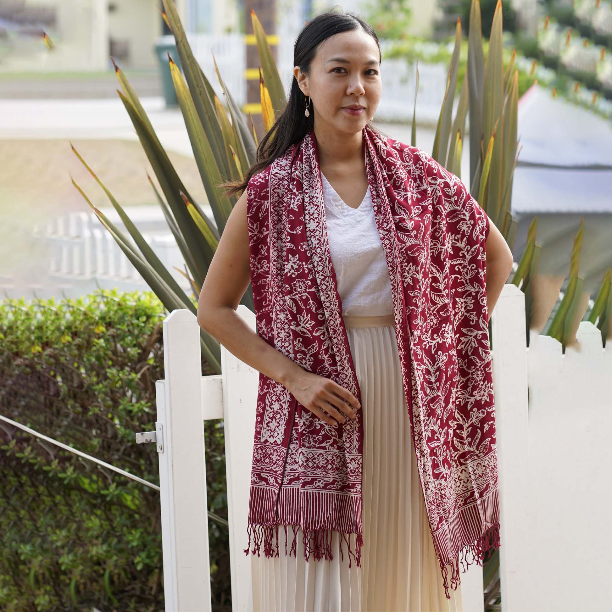 Handmade Batik Scarf, soft Cotton, Red White Cherish, Burgundy