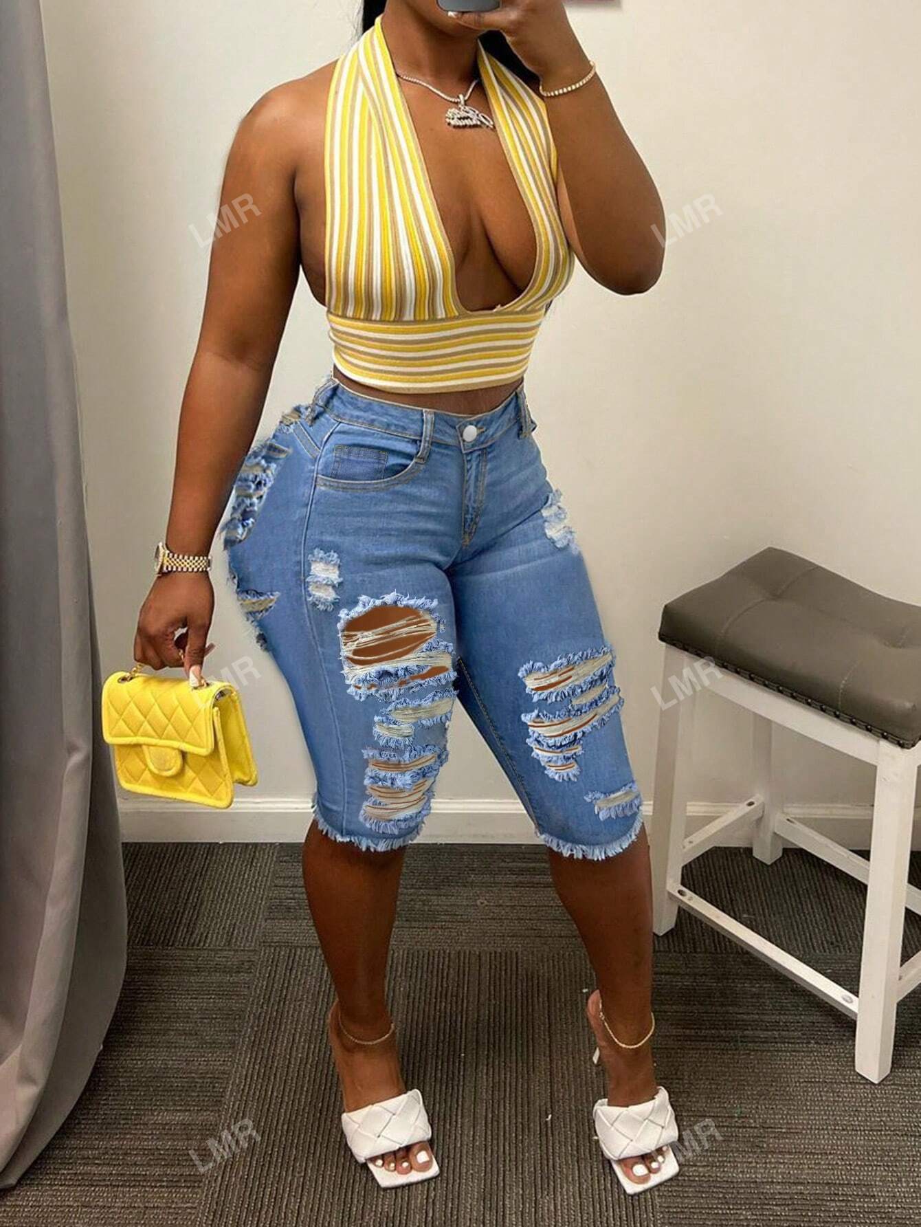 Ladies" Bermuda Casual Denim Shorts With Distressed Holes, Pocket And Frayed Hem
