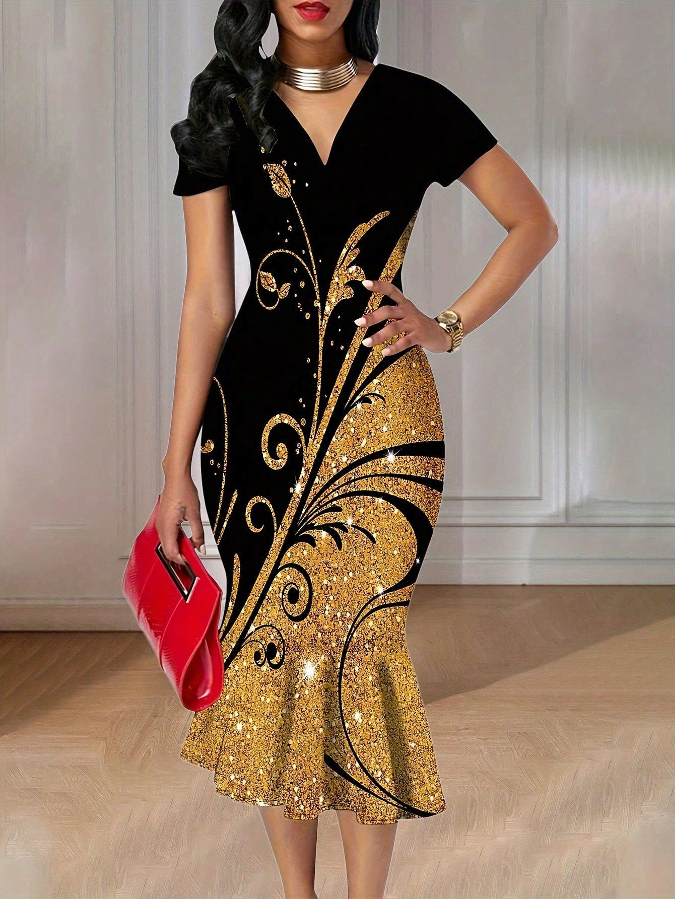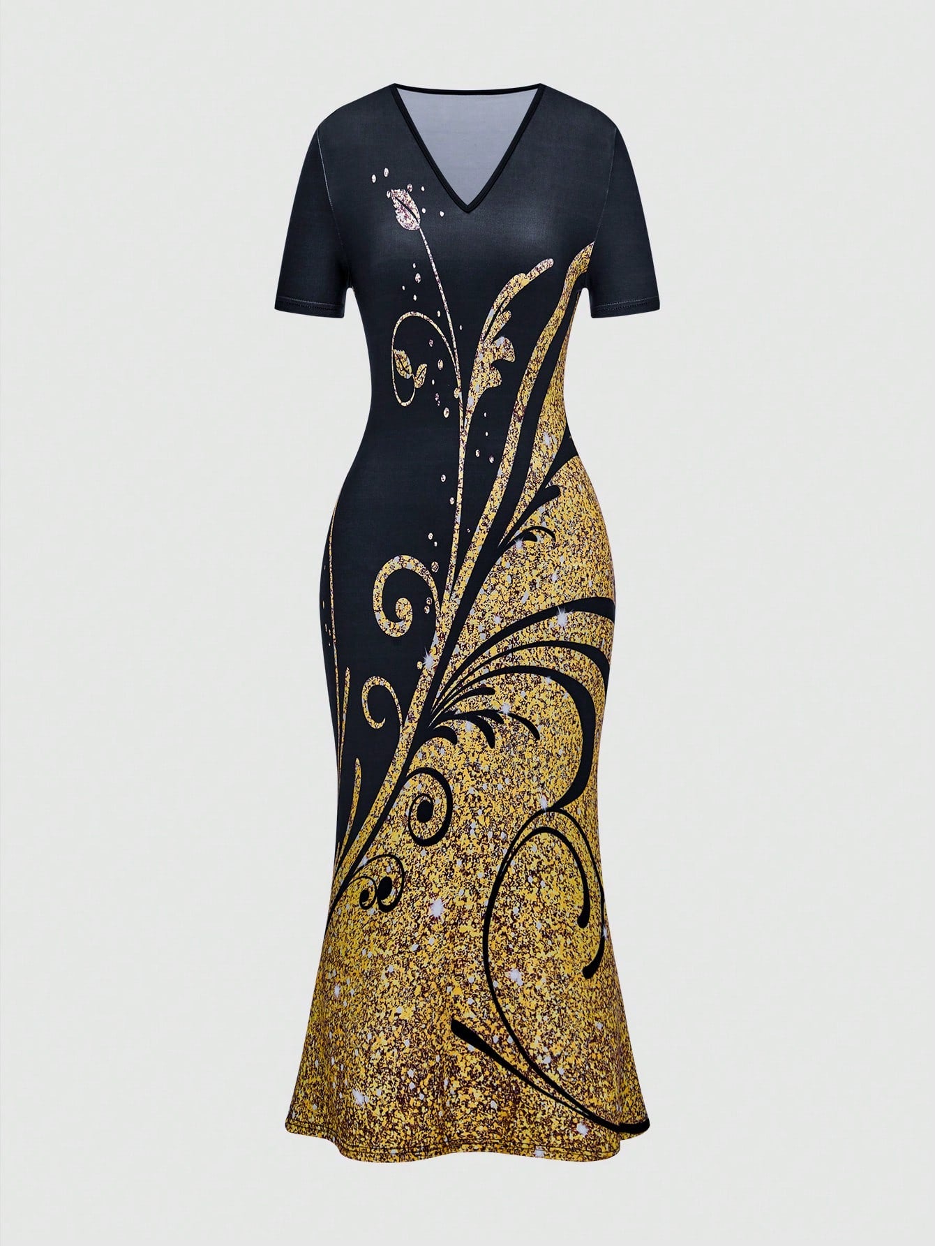 LUNE Plant Print Color Block V-Neck Mermaid Dress Maxi Women Outfit