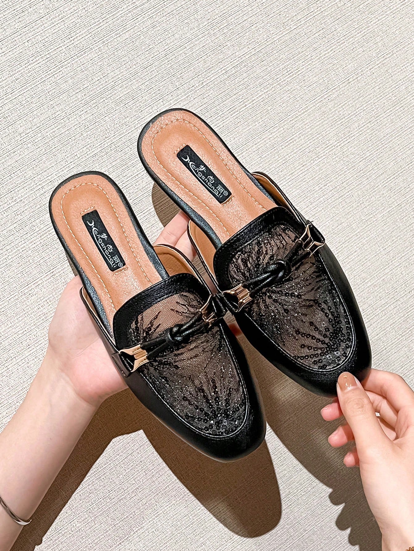 Mengshangli Women's Slip-On Mule Shoes With Metallic Decor, Half- Flat Sole Fashionable Slouchy Shoes