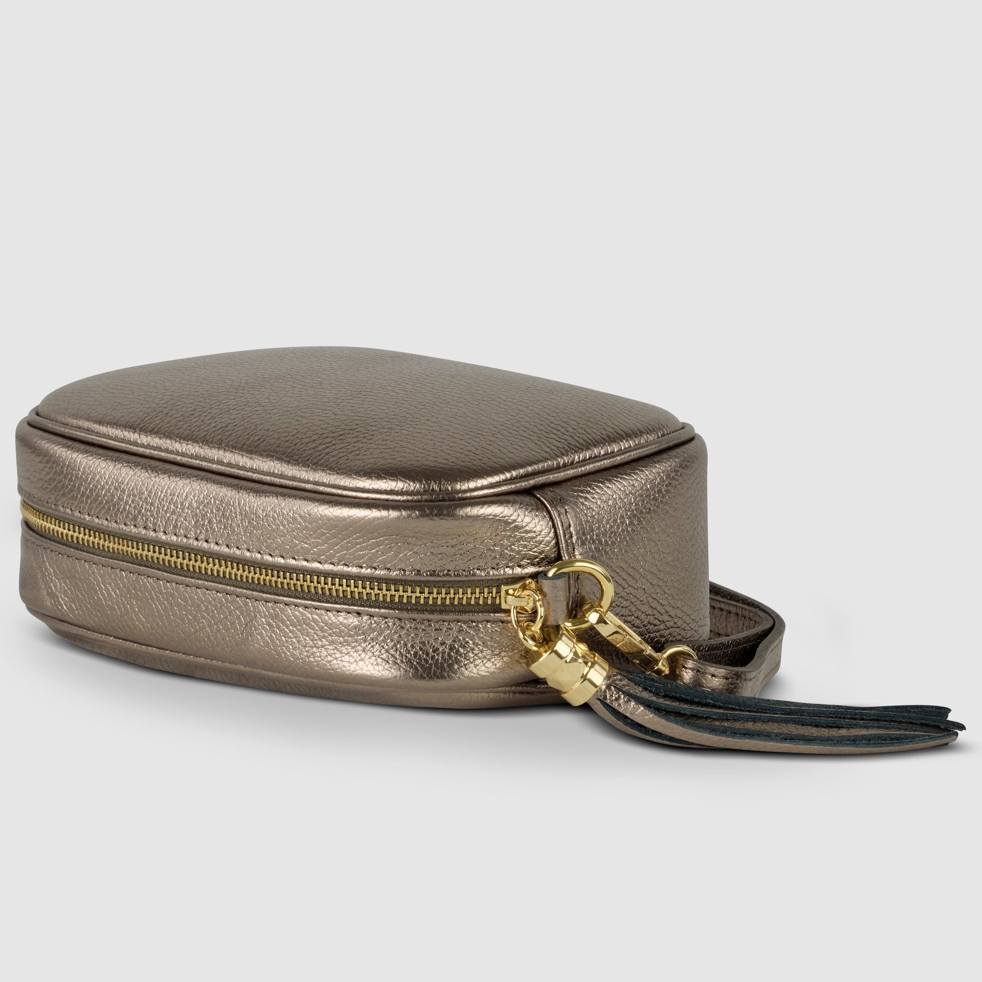 The body is made from natural calfskin with a subtle shine — luster calf leather. The smooth, lightly grained surface has a gentle metallic finish that highlights the richness of the material. It reflects the Florentine leatherworking legacy, combining sophistication with tactile appeal.