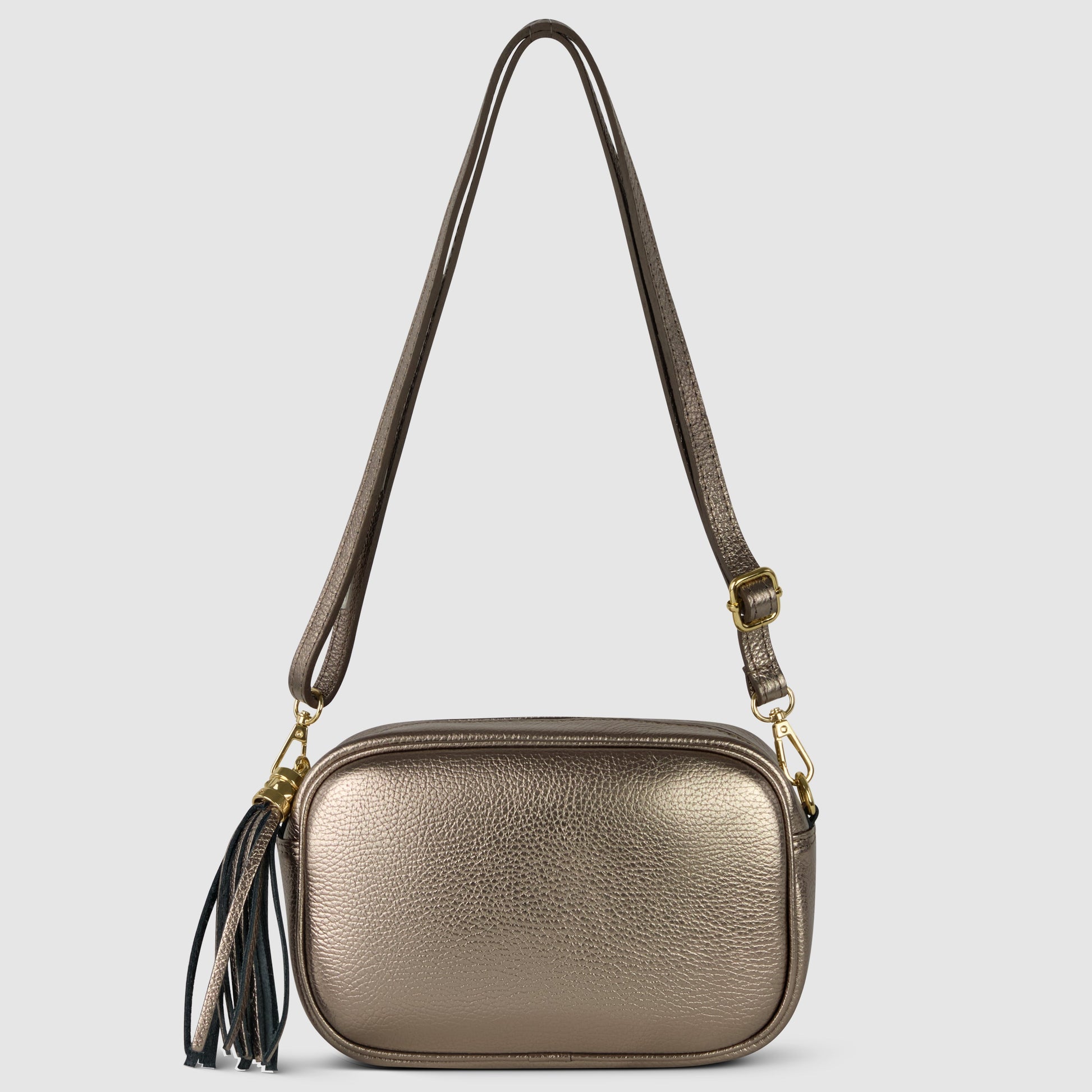 The zipper is finished with a matching leather tassel puller that adds texture and movement. The long strap adjusts for shoulder or crossbody wear and detaches easily for hand-carry styling. Gold-tone hardware throughout enhances its elegant feel.