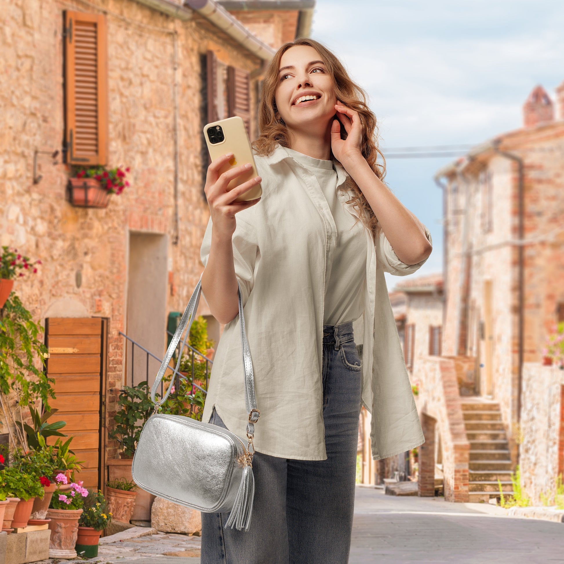 This exquisite mini bag from TAKEASY embodies refined Italian craftsmanship and artisanal quality. The thin metallic lamination on genuine suede glimmers softly with every movement, accentuating your unique style.
