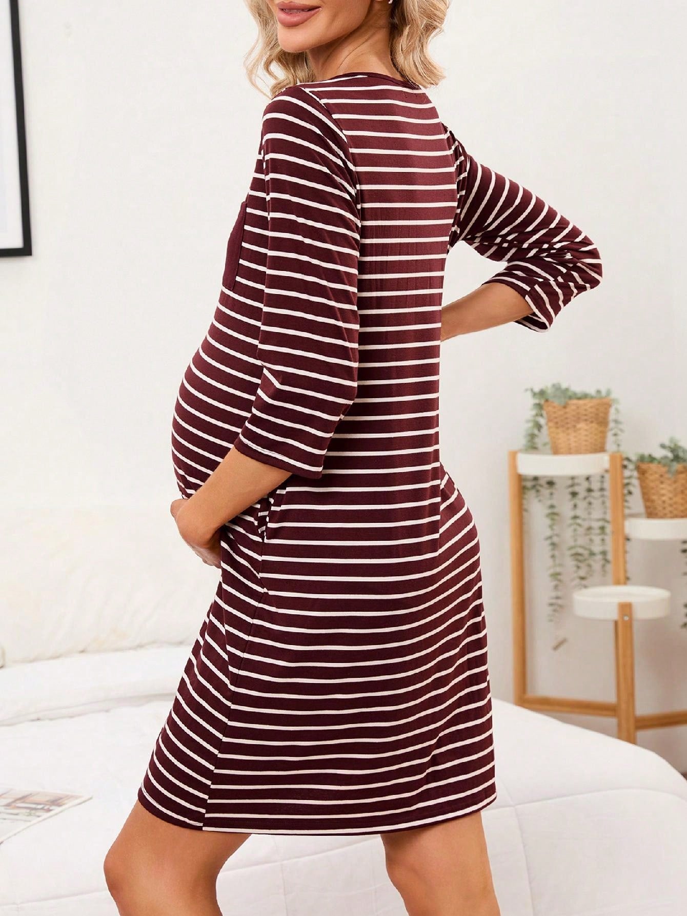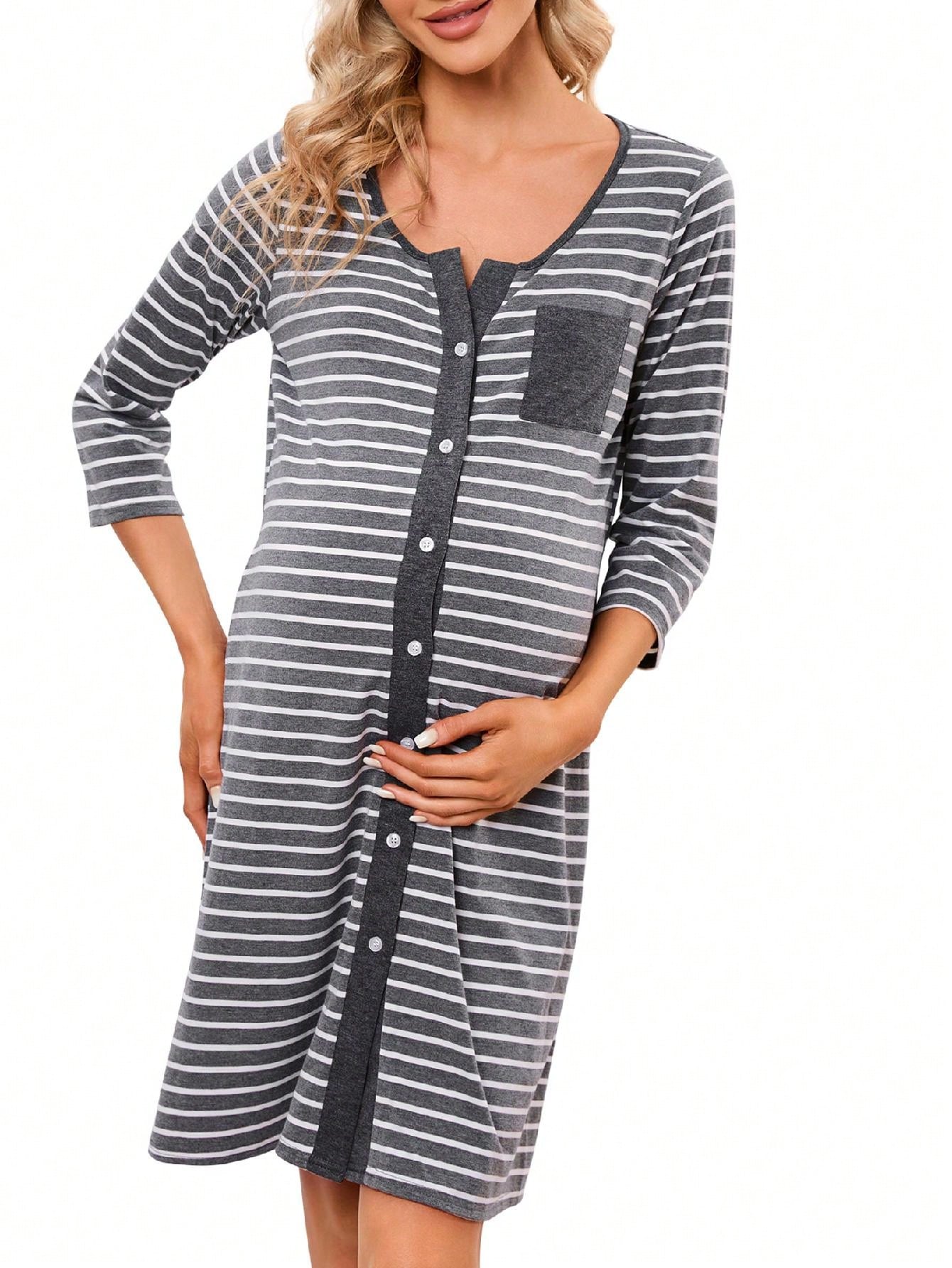 Mothers Day Gifts Maternity Nightgown Women's 3/4 Sleeve Striped Nursing Sleepshirt Full Button Breastfeeding Sleep Dress Burgundy 2XL