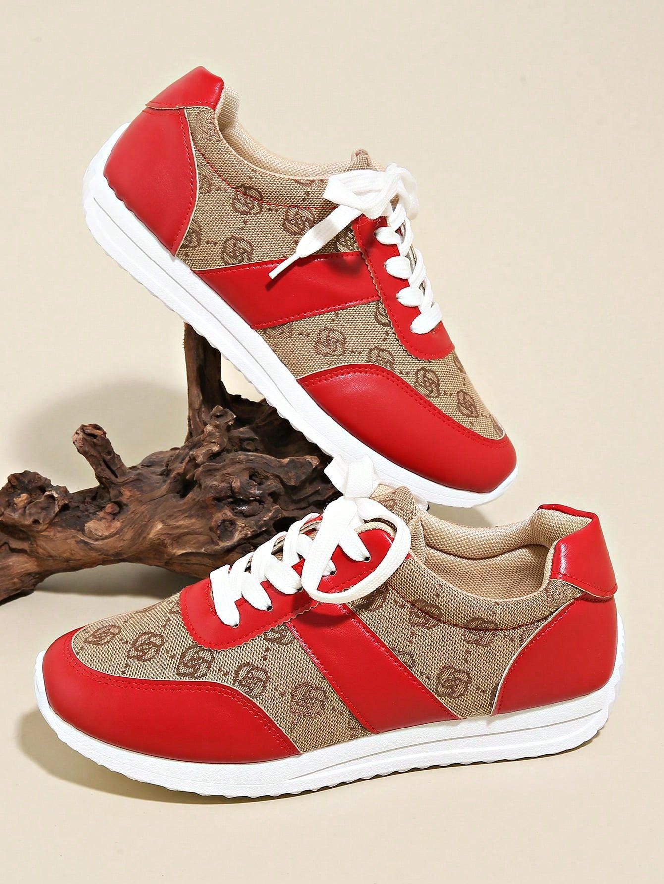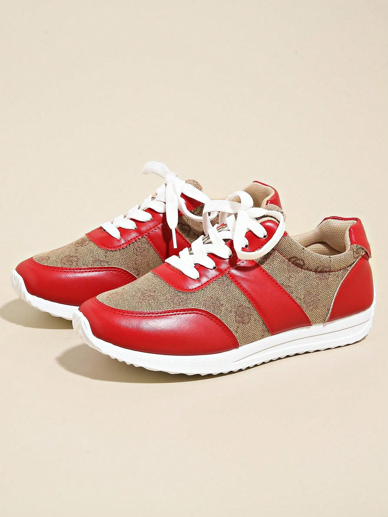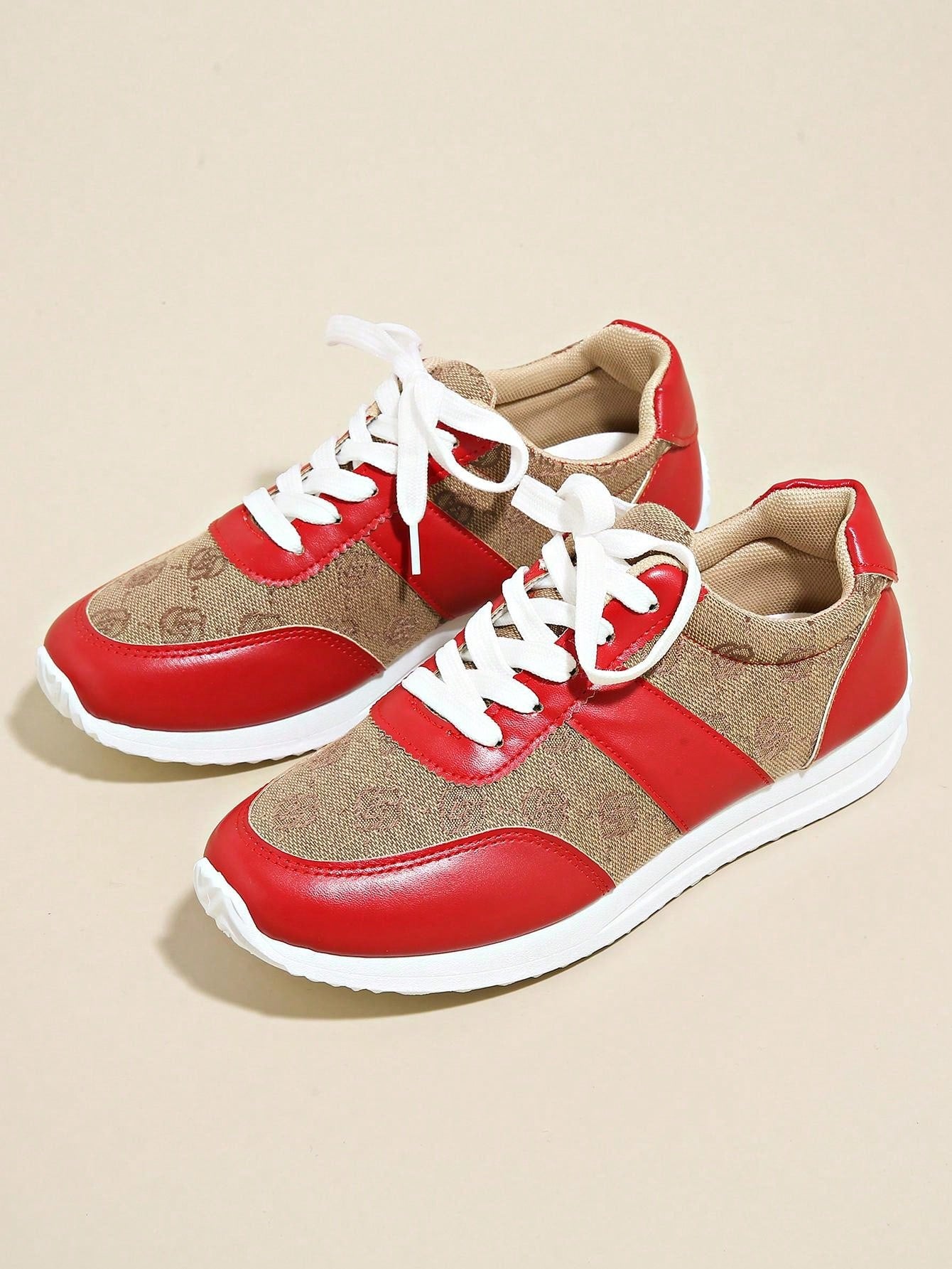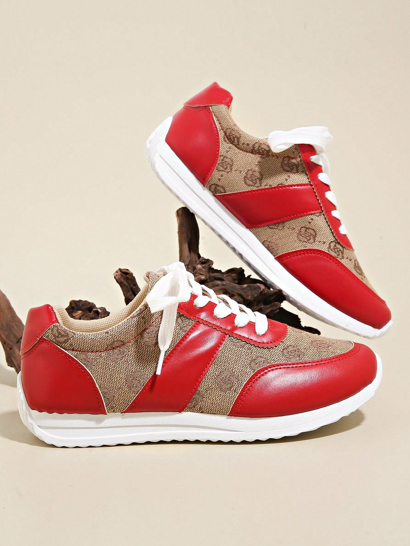 Plus Size 36-43 Women's Breathable & Odor-Resistant Flat Lace-Up Agane Running Sneakers, Anti-Slip, Suitable For Spring/Autumn, Hiking, Dancing, Fitness, Red Leather