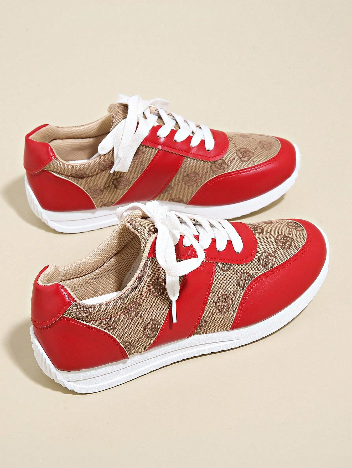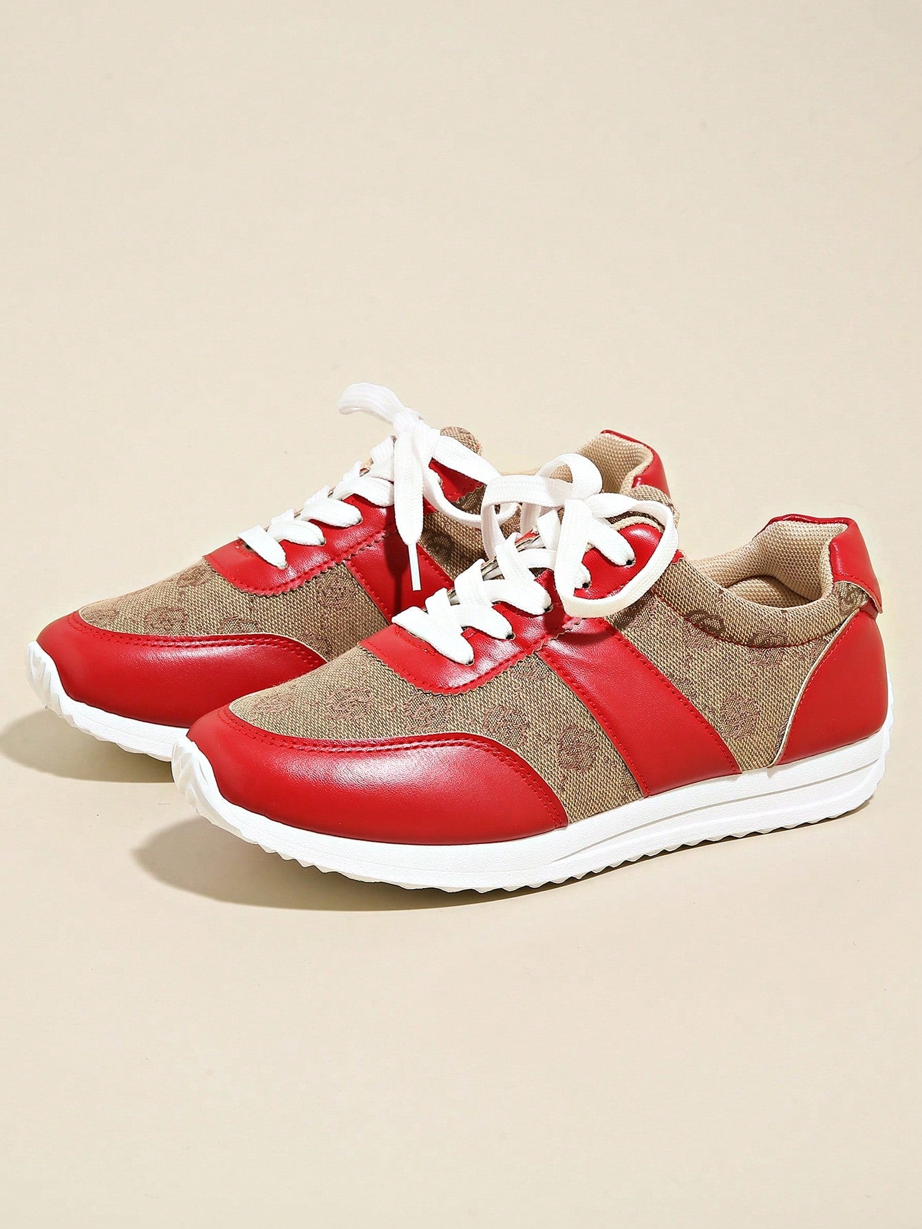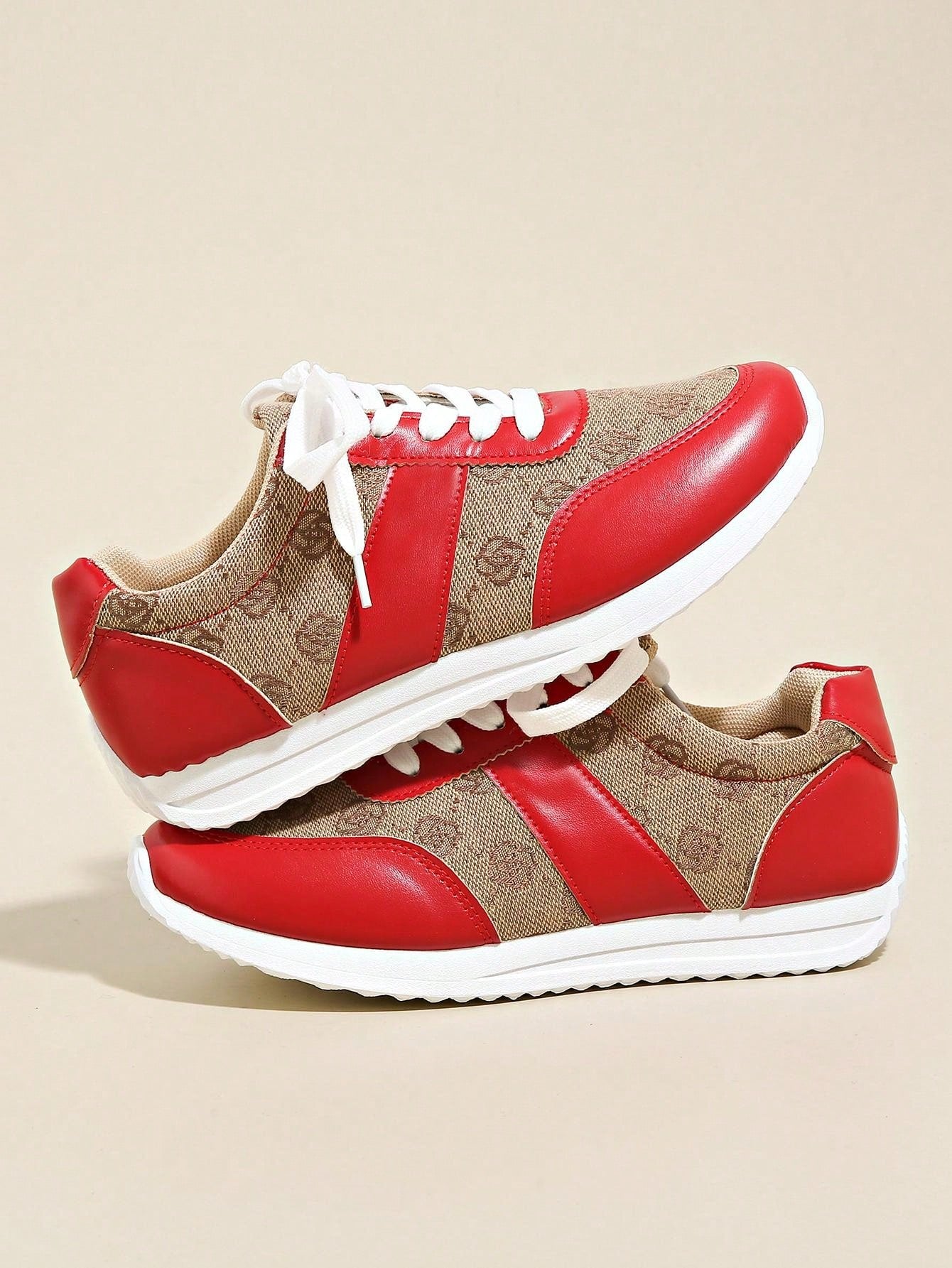 Plus Size 36-43 Women's Breathable & Odor-Resistant Flat Lace-Up Agane Running Sneakers, Anti-Slip, Suitable For Spring/Autumn, Hiking, Dancing, Fitness, Red Leather