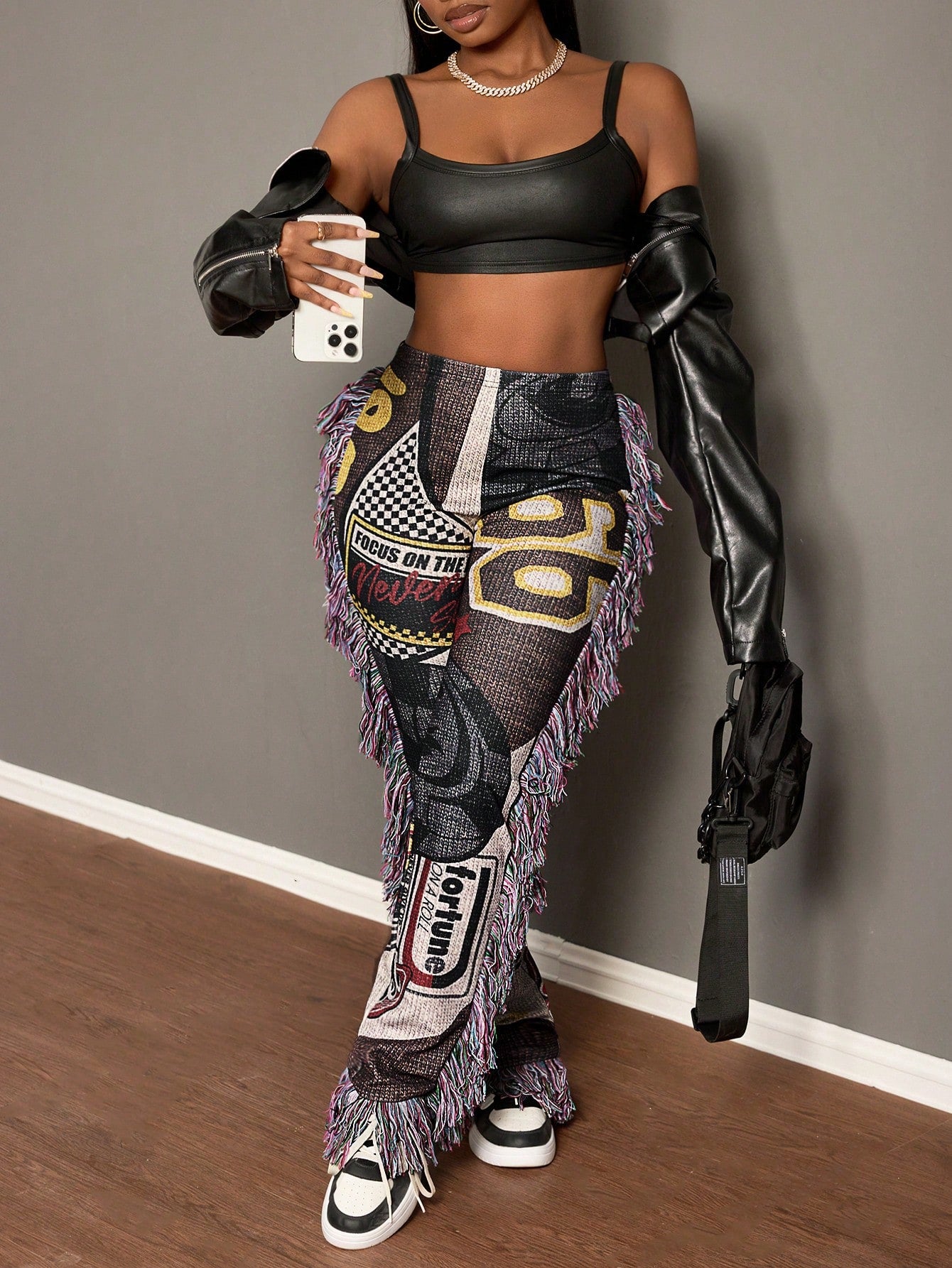 Slayr Autumn And Winter New Casual Street Retro Element Printed Tassel Webbing Decorative Trousers Women's Leggings-A