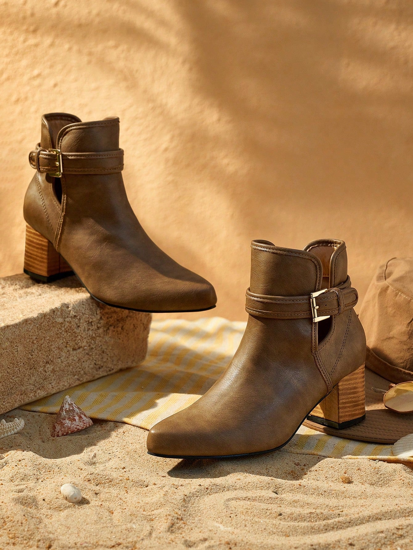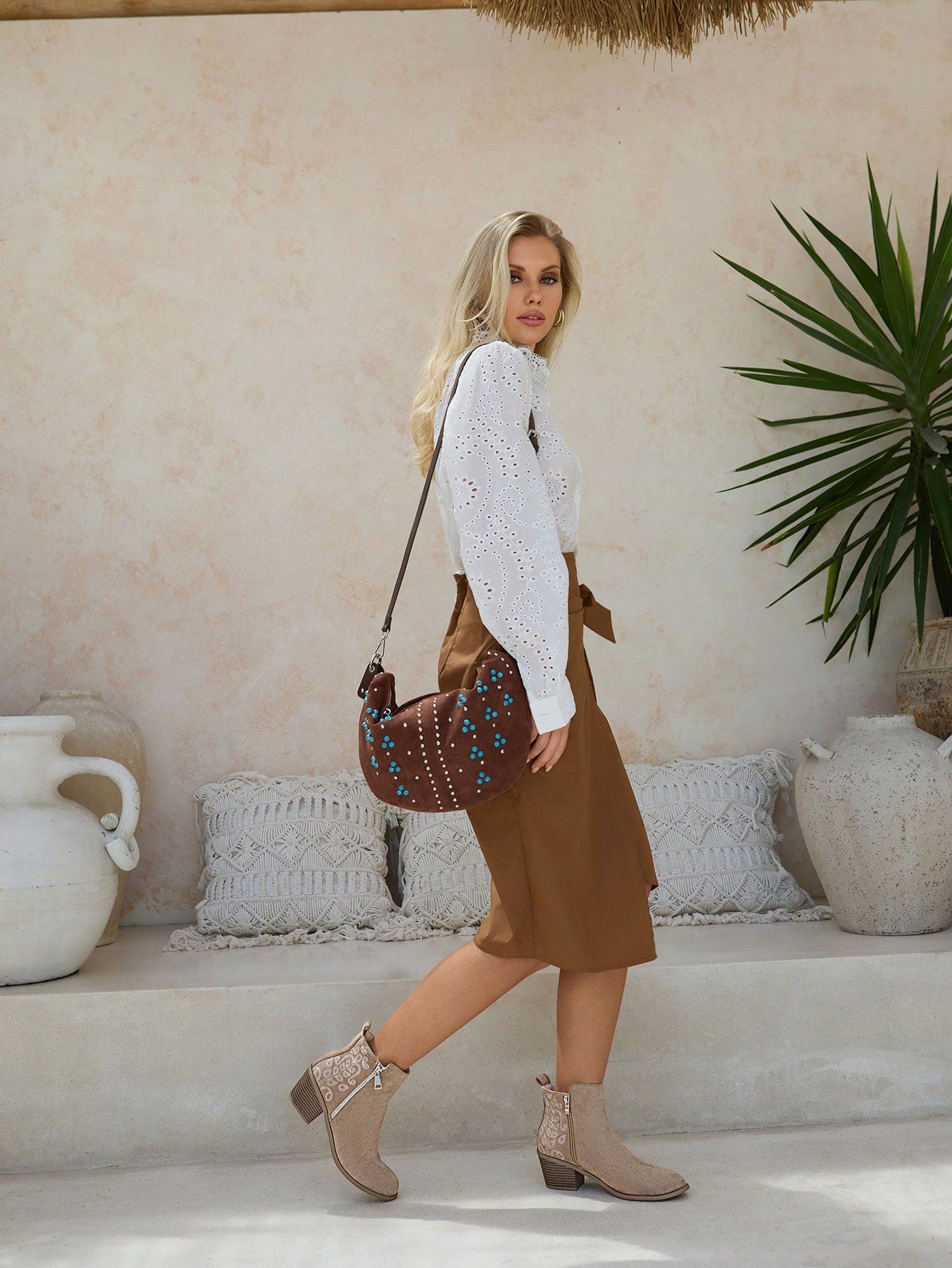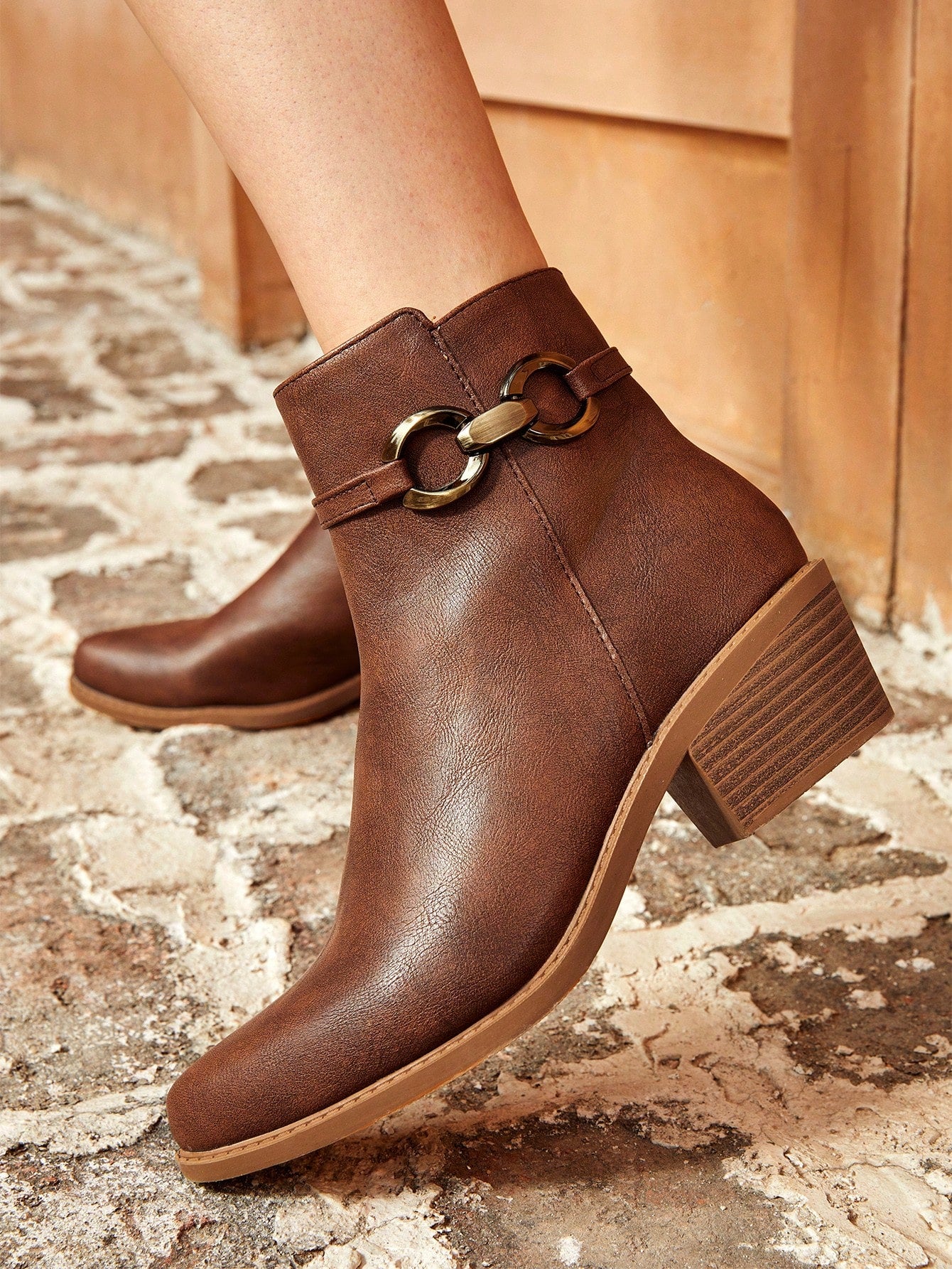 Styleloop Women's Fashionable Western Embroidered Chunky Heel Ankle Boots In Apricot, Fall Shoes For Christmas And New Year Holiday