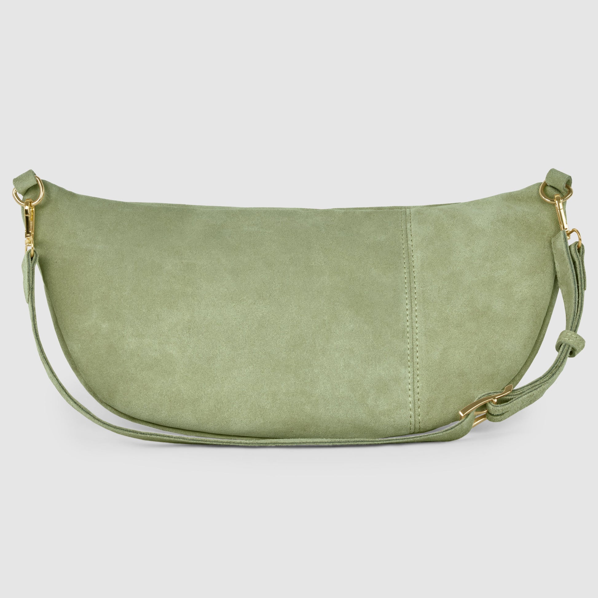 Immerse your look in Italian elegance with this handcrafted bag by TAKEASY. Its crescent shape, refined hardware, and soft suede texture create a unique silhouette that's both recognizable and unforgettable.