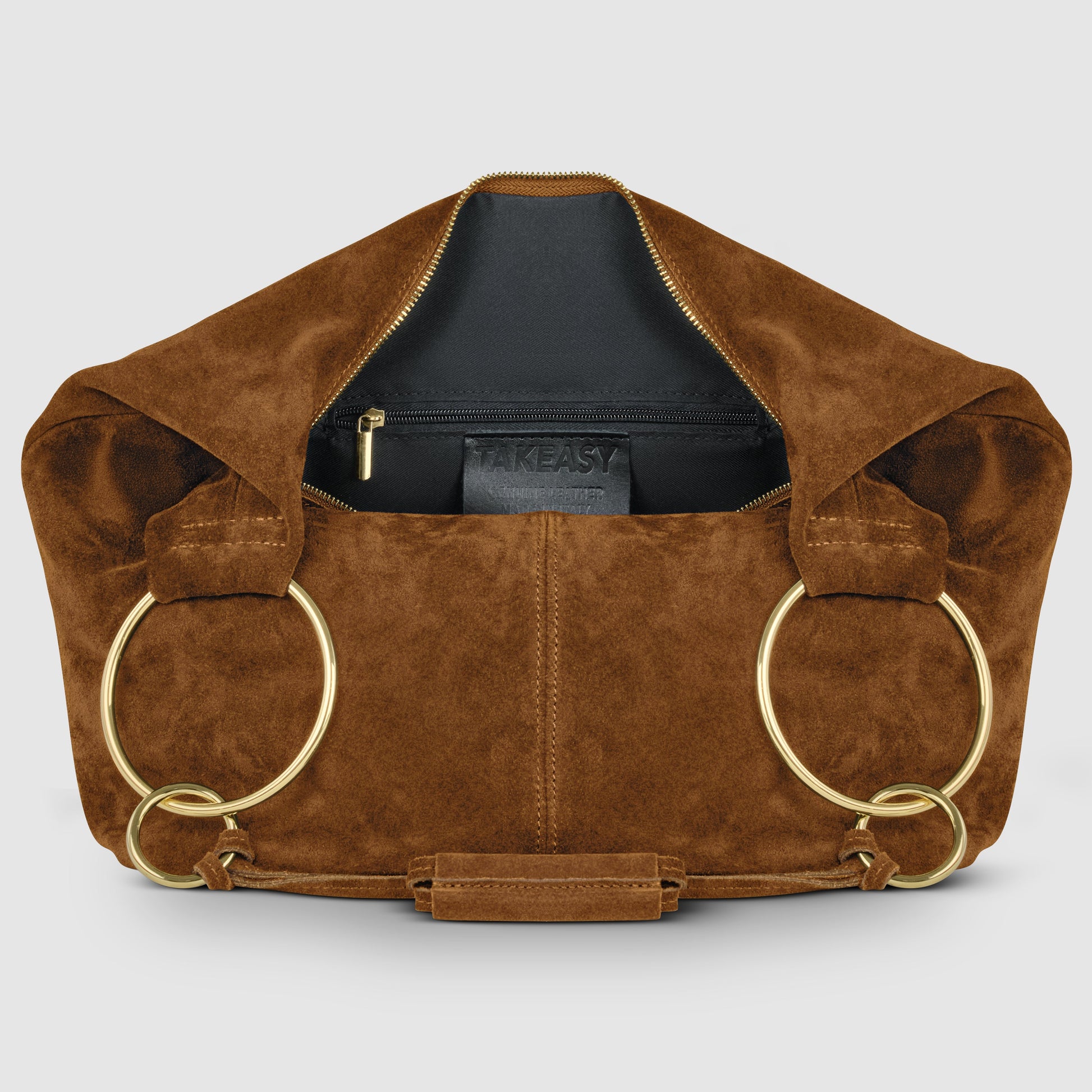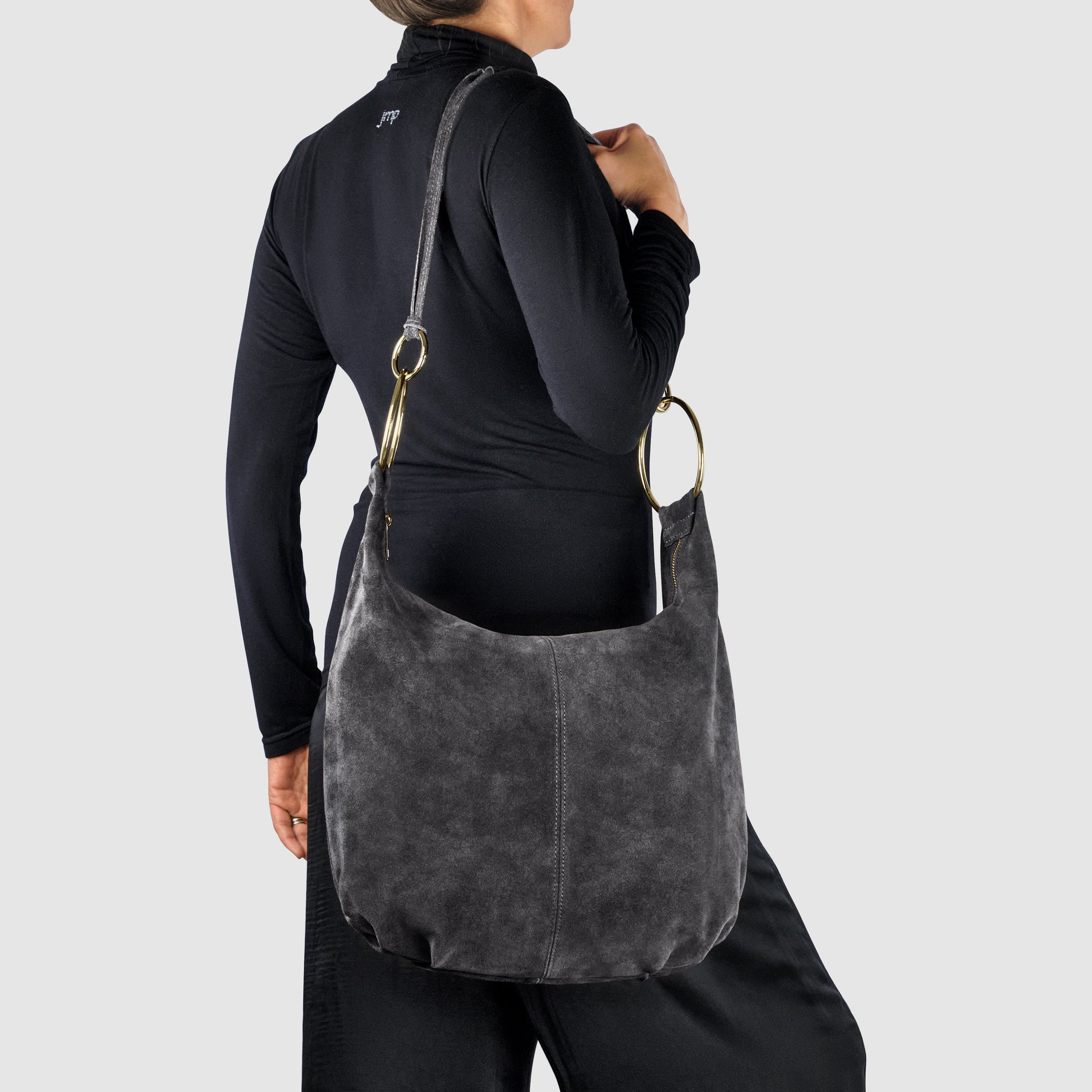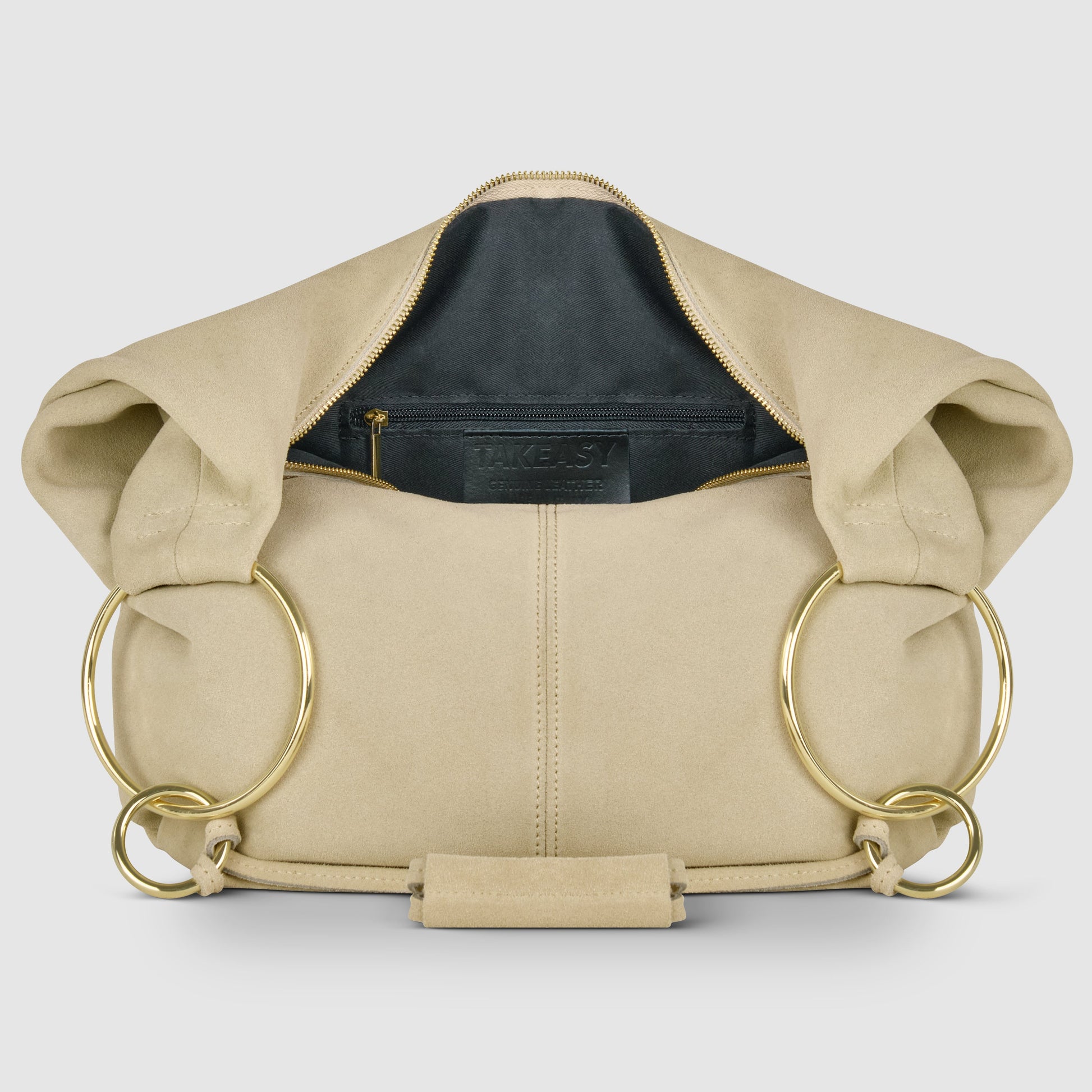 Two slim straps, joined with decorative knots, flow into a wider leather grip that’s comfortable on the shoulder. Gold-toned metal rings in two different sizes accentuate the silhouette and provide light structure.