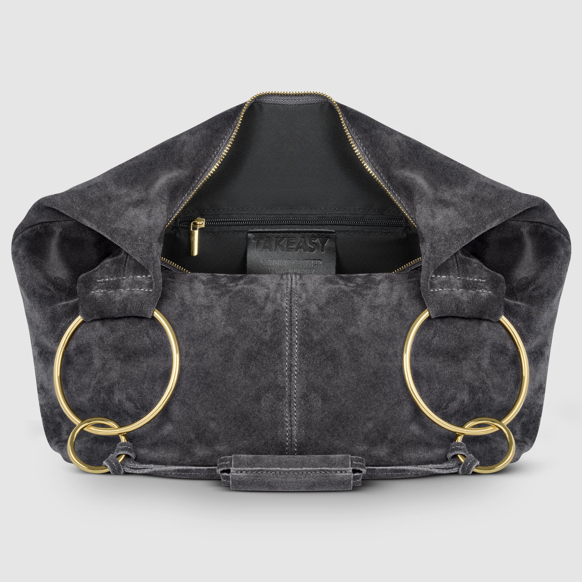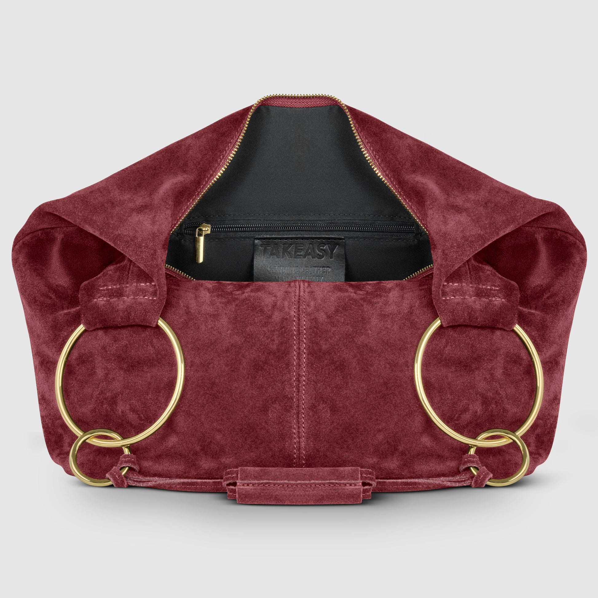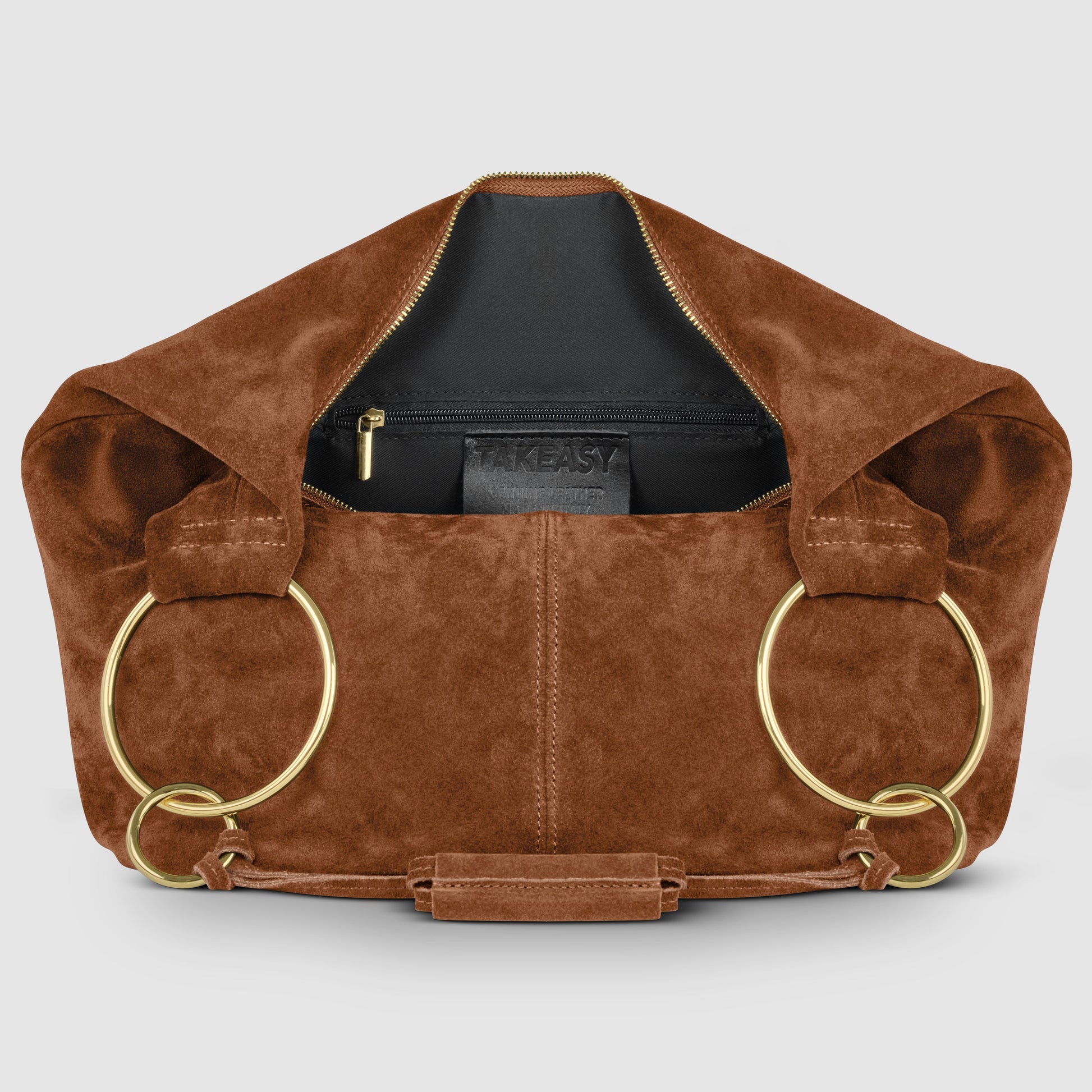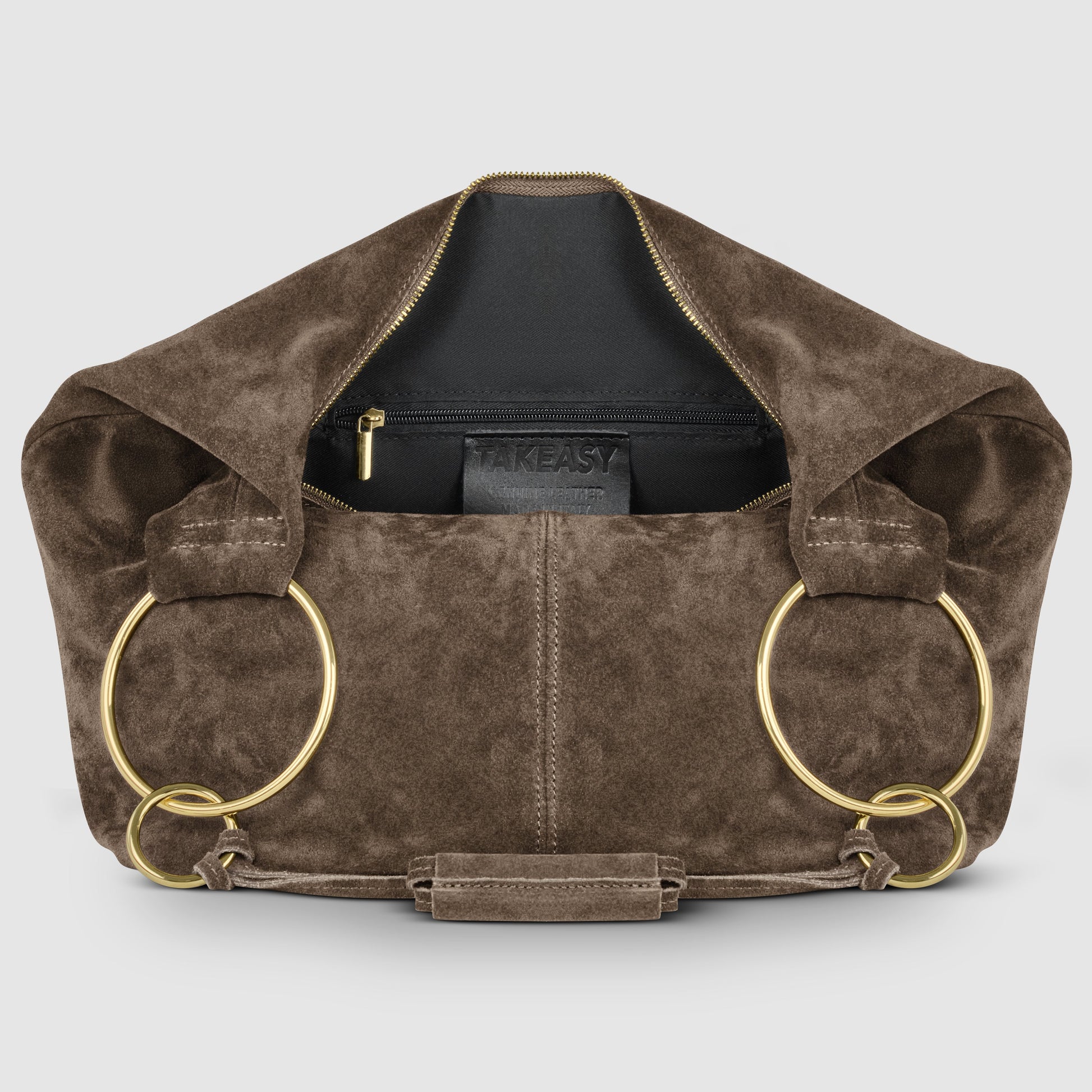 Two slim straps, joined with decorative knots, flow into a wider leather grip that’s comfortable on the shoulder. Gold-toned metal rings in two different sizes accentuate the silhouette and provide light structure.