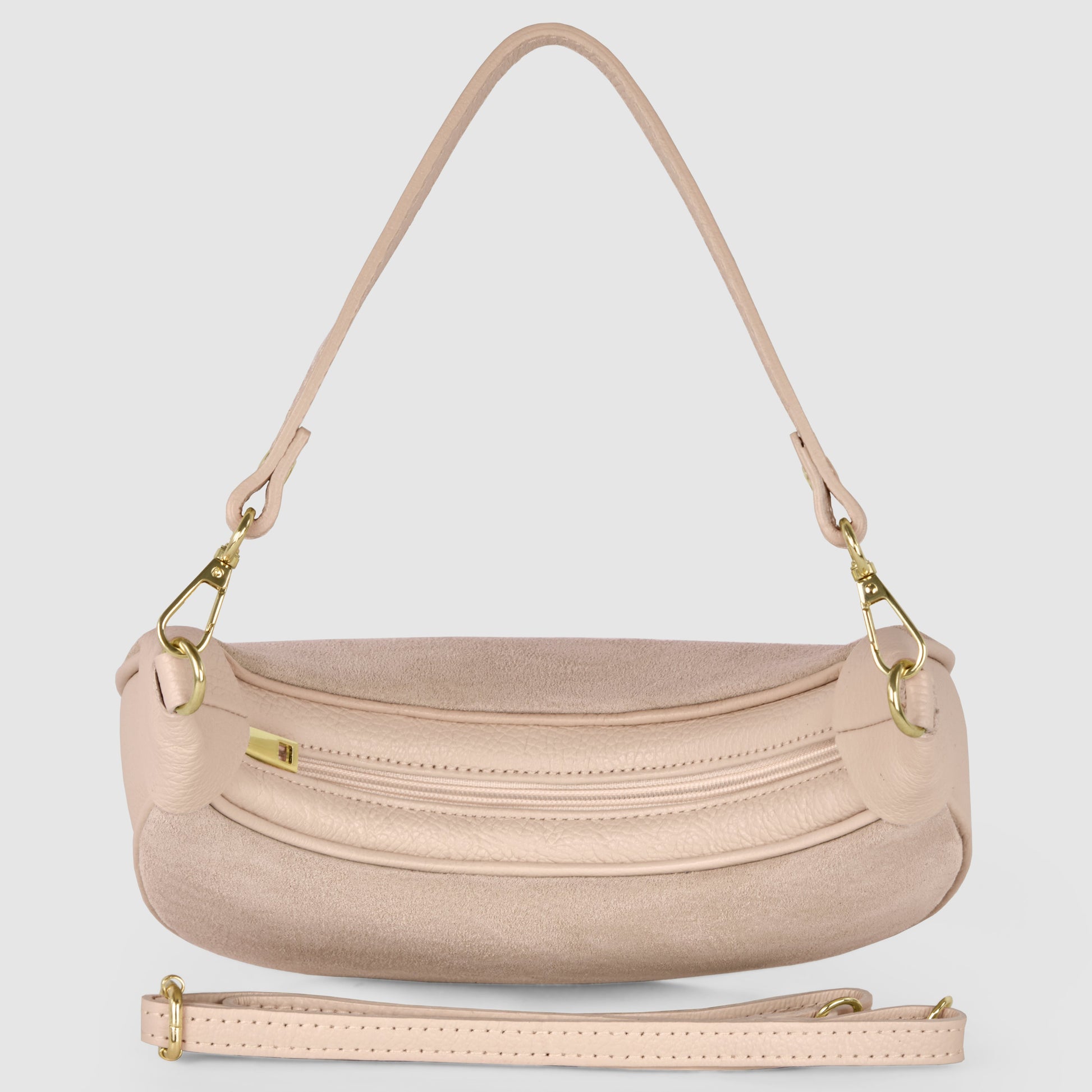 The primary material is genuine suede leather with a soft, velvety texture, complemented by pebbled calf leather. This sophisticated combination reflects the traditions of Florentine leather craftsmanship. Polished gold hardware adds the final luxurious touch.