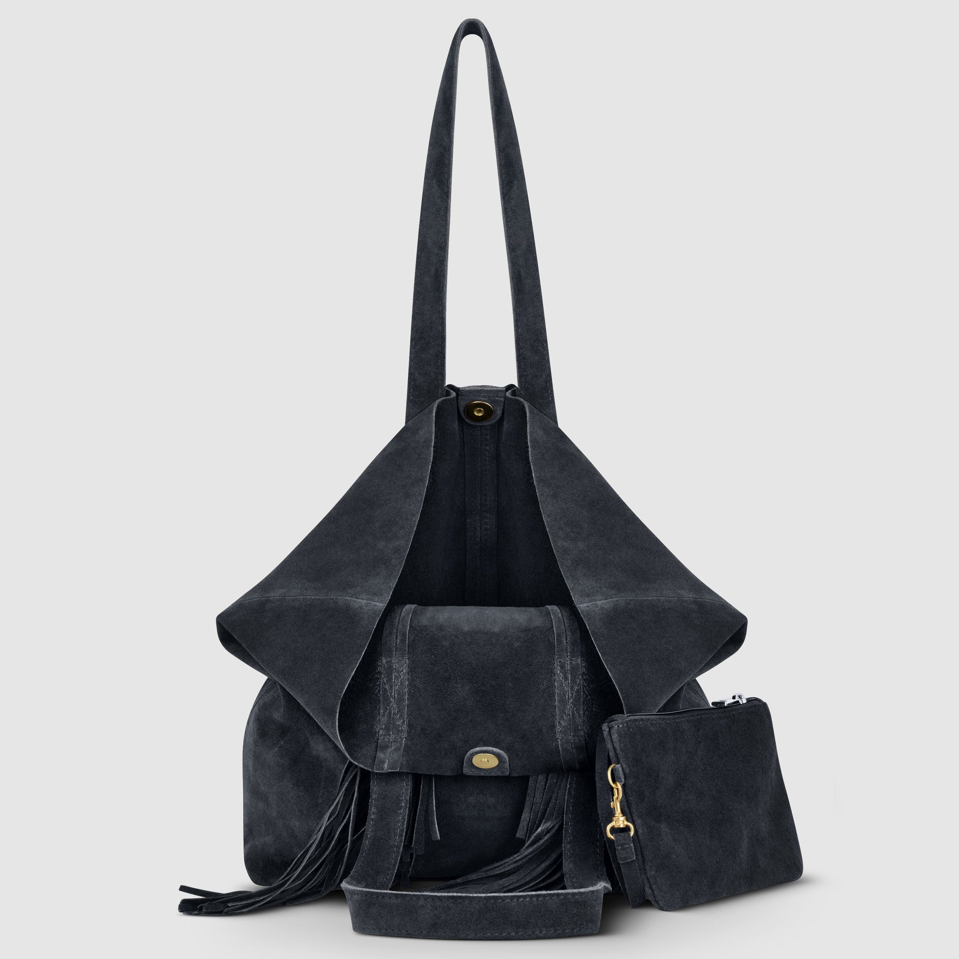 Inside, a spacious single compartment reveals the raw backside of suede, left unlined. There’s plenty of room for daily essentials—from a laptop and notebook to a makeup pouch and documents. A detachable zippered suede wallet on a leather strap adds versatile storage.
