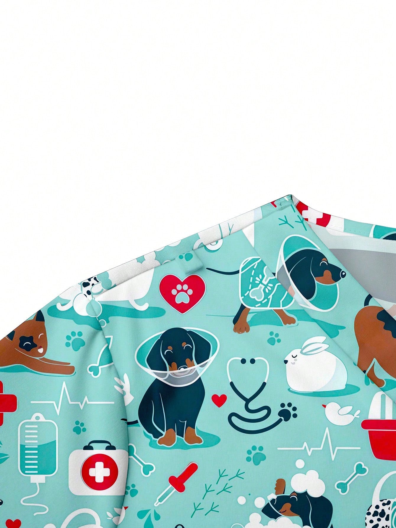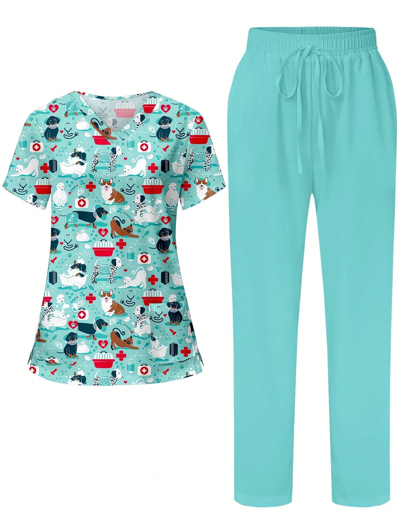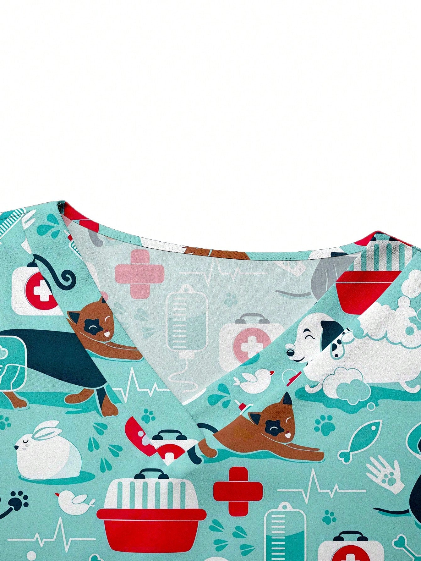 TaskFit Cute Cartoon Animal Print V-Neck Short Sleeve Pocket Uniform Set For Women, Scrubs With Ear Loops & Side Slits