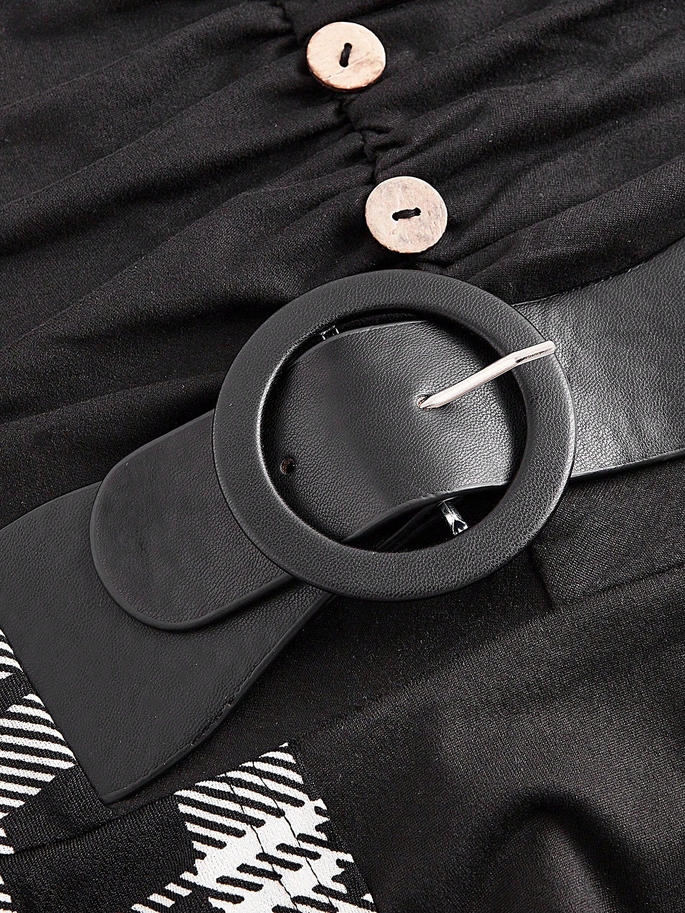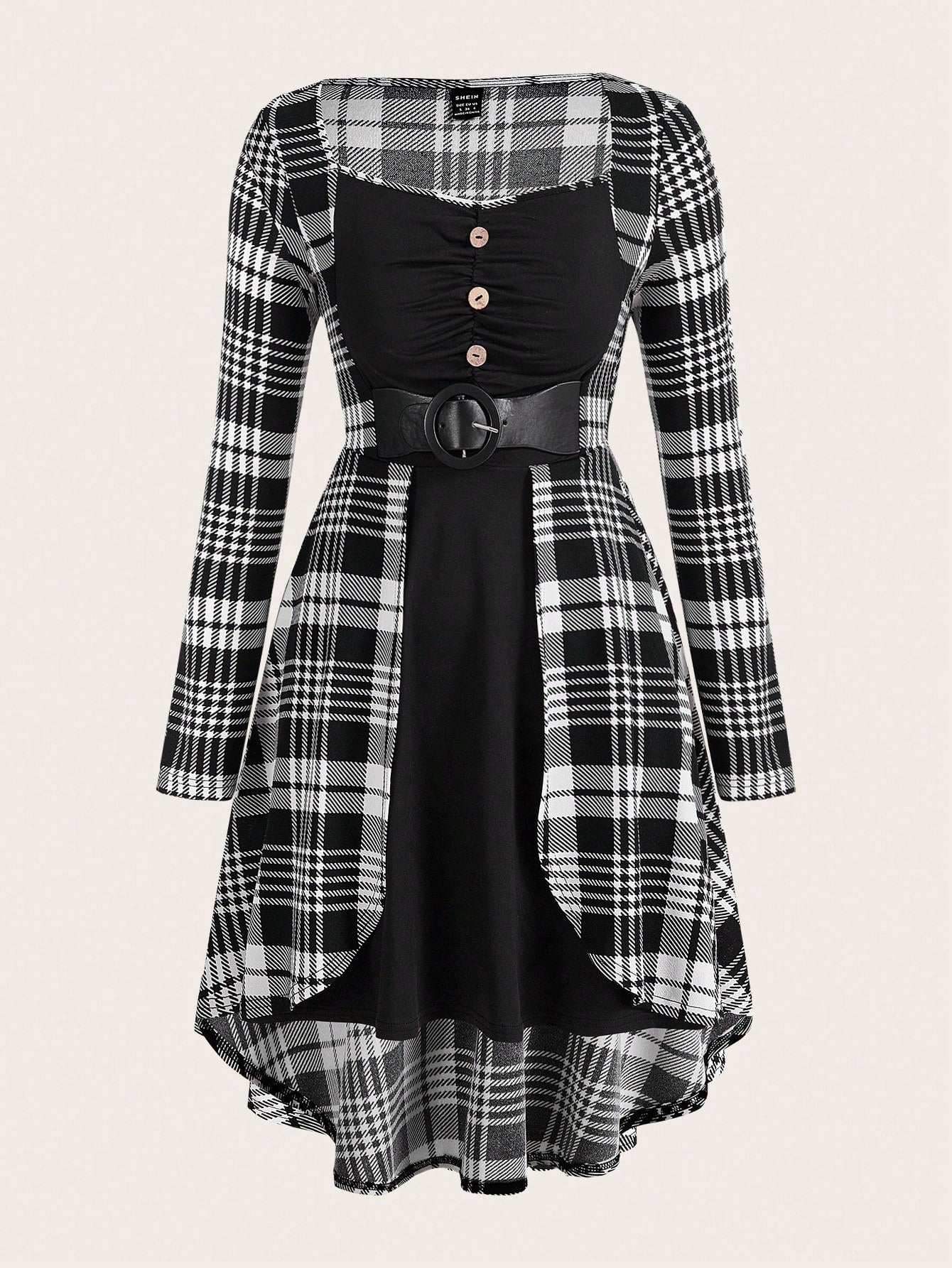 Unity Plaid Print Button Front PU Leather Buckle Strap Detail Dress