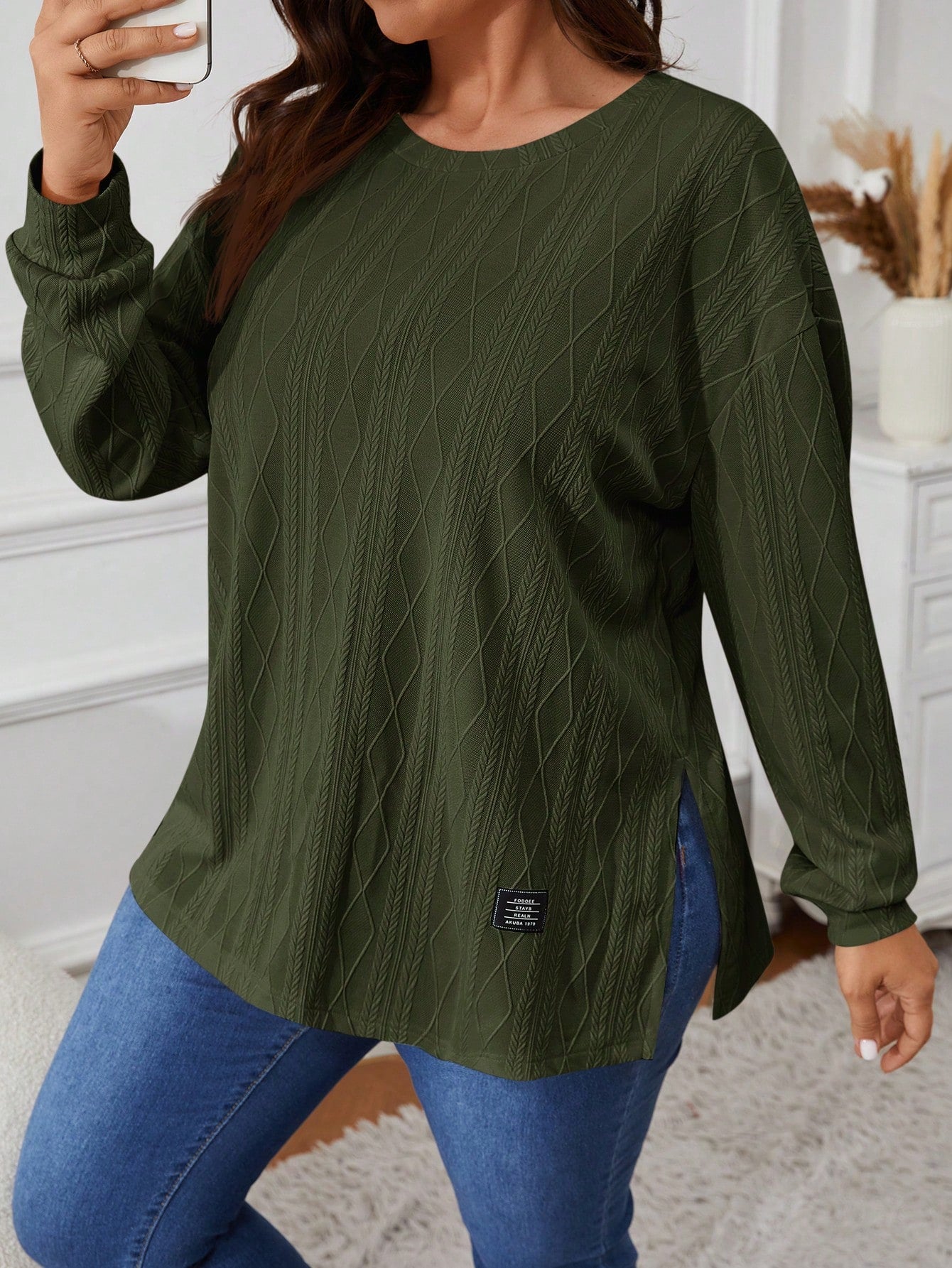 VCAY Plus Size Women Letter Print Dropped Shoulder Crew Neck Long Sleeve Casual T-Shirt, Autumn