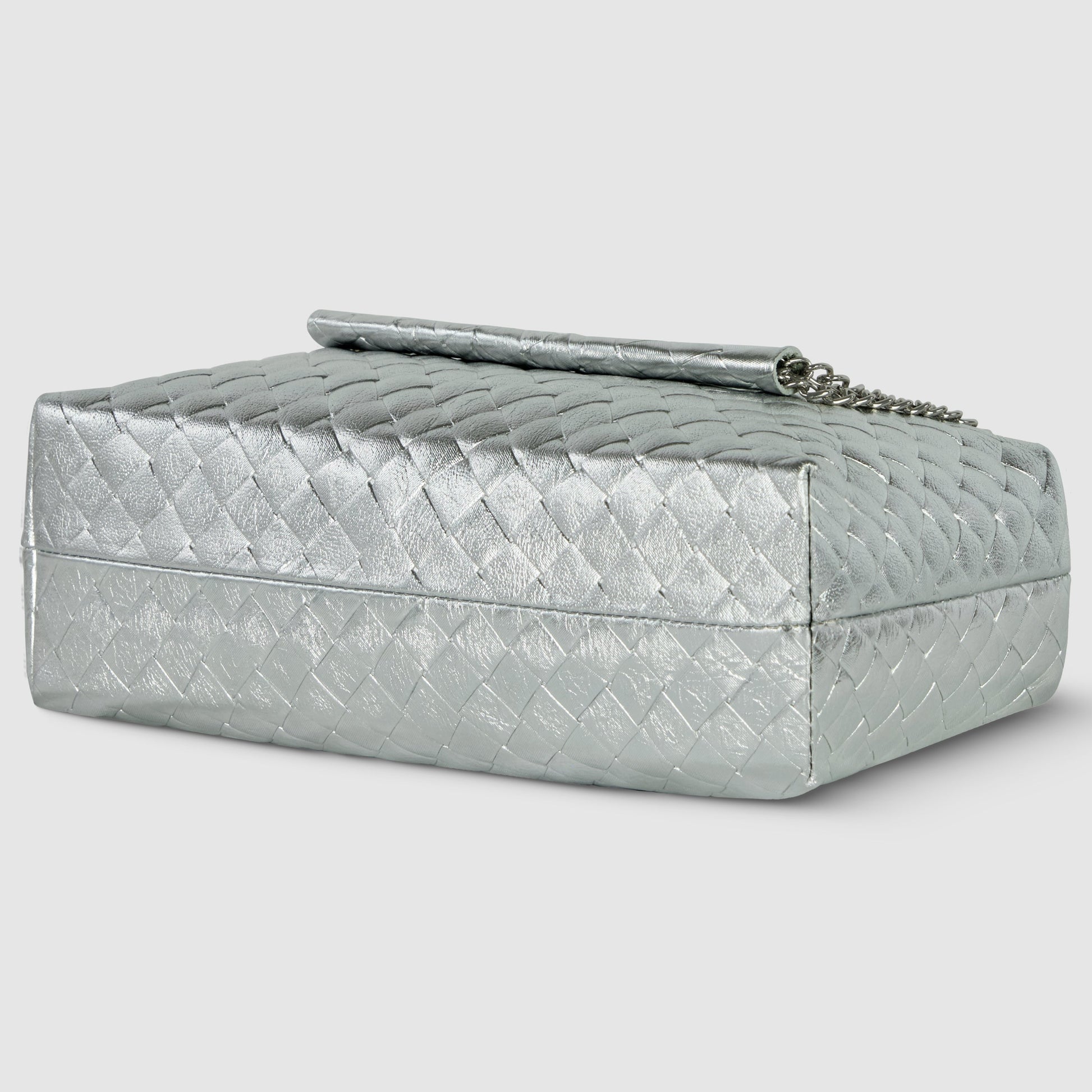 The Weave Gleam Suede leather is treated by Florentine artisans. With its glowing laminated surface and velvety base, the embossed geometric texture resembles faceted gemstones, giving the bag a jewelry-like presence.