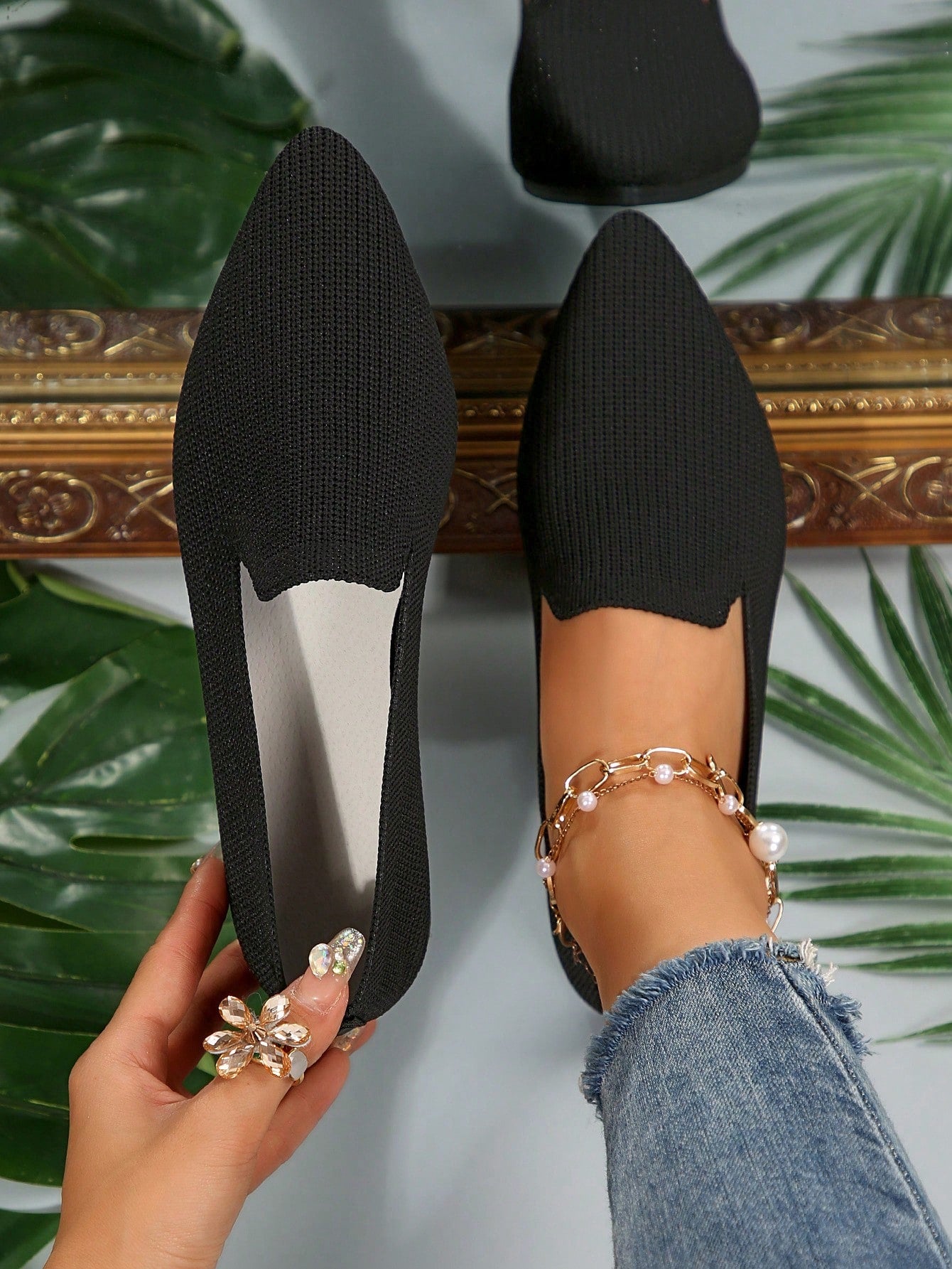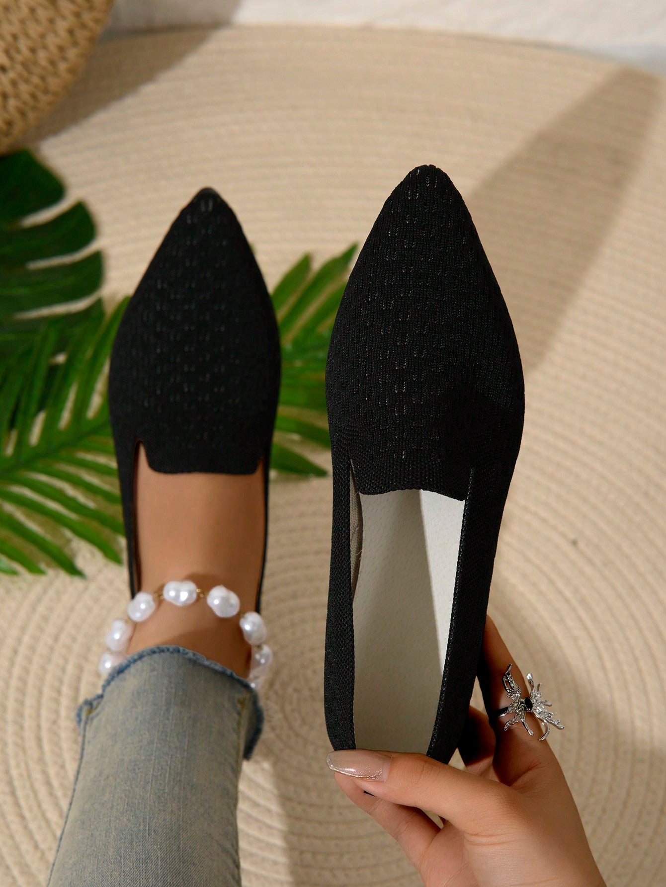 Women's Solid Color Flat Shoes, Breathable Knitted Pointed Toe Slip-On Shoes, Lightweight & Comfortable